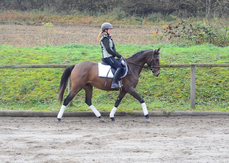 Elegante rittige braune Stute, sehr gelehrig und zeigt sich in der täglichen Arbeit mit Einstellung und angenehmen Sitzkomfort, vermittelt sie ein tolles Reitgefühl. Sie bietet ideale Voraussetzungen für den vielseitigen Einsatz für Freizeit, Halle, Dressur, sowie Geländeausritte. Sie kennt auch Straßenverkehr und Feria.