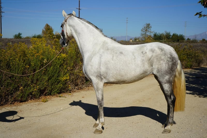 Diestra BG's Background Breed - Andalusian Gender - Mare DOB - 04/08/19 Price - $8,499 Eligible for IALHA papers. Excellent morphology and movement for a high standard breeding program Family Background - Sire (Armas Diestro) Armas Diestro was the direct son of Judio VII. Judio VII is a Carthusian horse. A Carthusian stallion that inherited consistent classical conformation and temperament. - Dam (Queen Diana) Descendant of Sandokan, an iconic horse throughout Mexico and the United States. Sandokan offspring are a guaranteed success under saddle. Sandokan's lineage is proven with many of his offspring winning in halter, piaffe, and dressage competitions. Don't miss out on this great opportunity and contact us. Visit https://www.whitestallionhay.com/horses to view more horses.