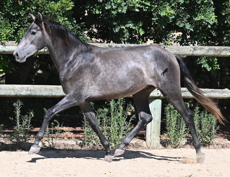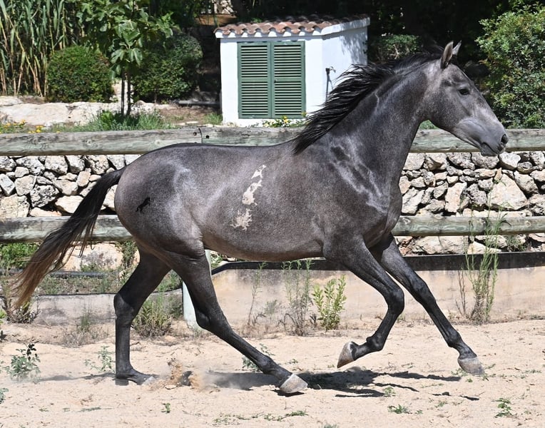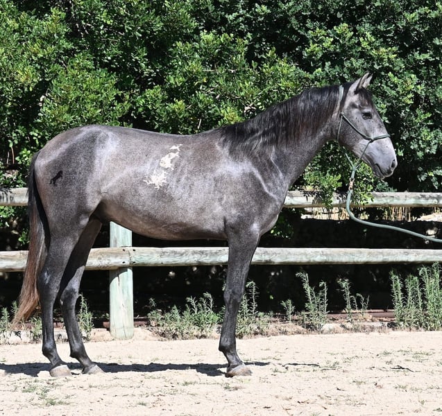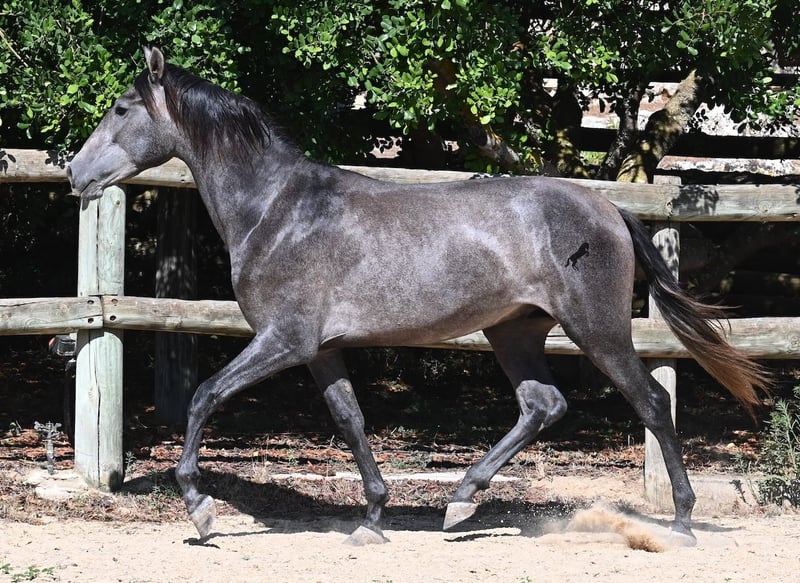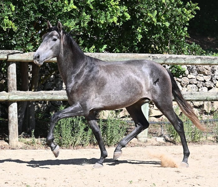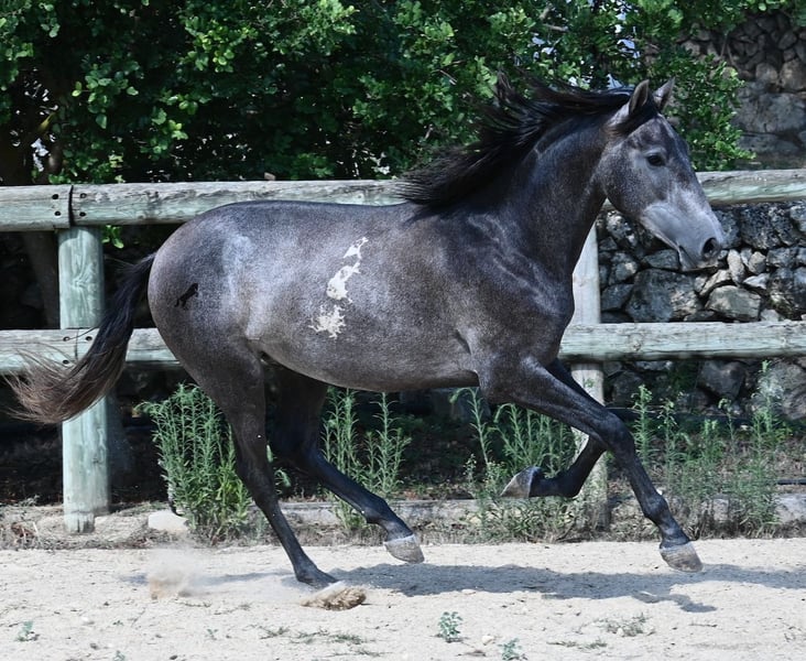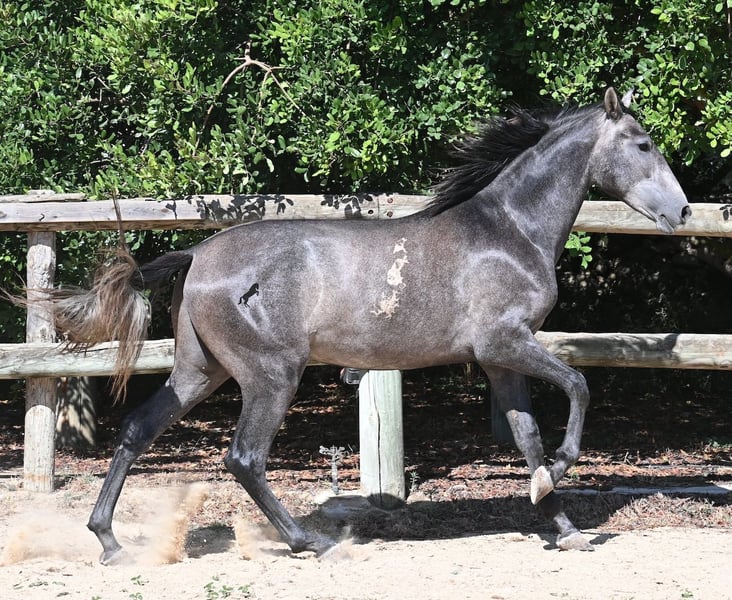 This PRE stallion, born in spring 2023 (Andalusian with breed certification from ANCCE), is still a real youngling. Since he has a lot of Cartujano blood (Cartusian), he is a late developer, as these former horses of the kings take their time to become truly proud and impressive horses. And he is being given time; just a few weeks ago, he was separated from his stallion buddy and is now in a large paddock box. Twice a week, gentle groundwork is done with him, following horsemanship principles, to provide him with a solid foundation for his future life as a riding or driving horse. He already picks up his hooves, allows himself to be groomed, and responds well to body language during groundwork, moving nicely into backing up. He currently stands at 155 cm, with a few more centimeters expected to come—like I said, a late developer ;) Castration on-site would be possible if stallion keeping is not an option. His location is Menorca. Videos and pedigree available upon request. I would be happy to organize a vet check, castration, transport, or even your travel arrangements should you wish to come and see him in person. Details can be found on my page or discussed in conversation.