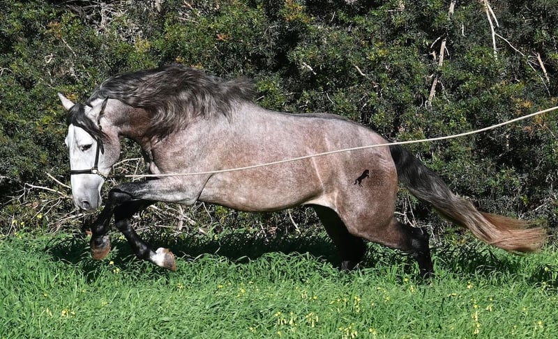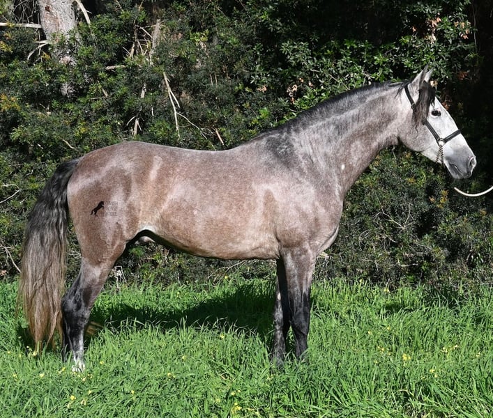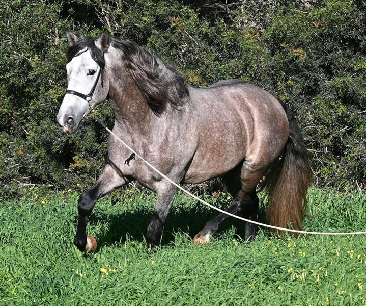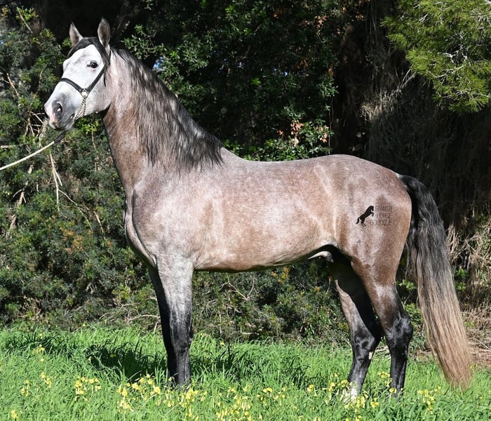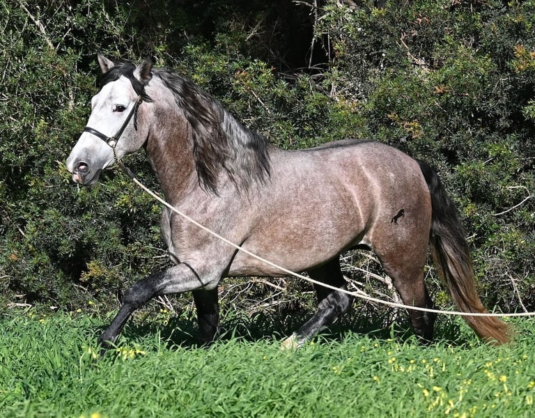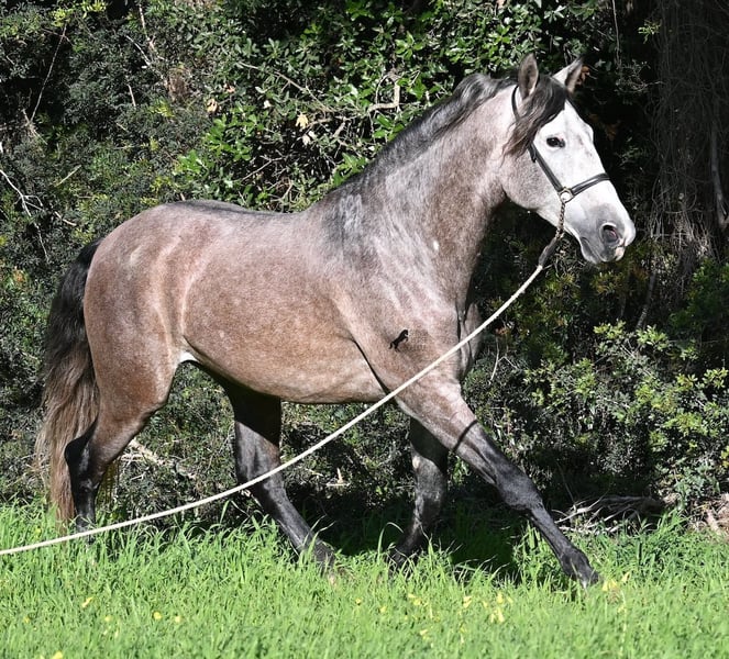 Este caballo PRE, nacido en verano de 2021 (Andaluz con certificado de raza de la ANCCE), ya es un hermoso ejemplar, ¡y eso a pesar de que aún no está completamente desarrollado! Con una altura de aproximadamente 1,65 m, ya impresiona y no requiere mucha imaginación para imaginar cómo será de adulto (será completamente blanco). Es un ejemplar muy bien educado y siempre atento a su jinete, con la intención de hacer las cosas bien y evitar cometer errores. Solo fue montado por primera vez en invierno de 2025, ya que los PREs grandes necesitan tiempo para crecer, y él lo ha tenido. Esto ahora da sus frutos, ya que es muy dispuesto a aprender y disfruta trabajar, porque nunca ha sido sobrecargado. Bajo la silla, tiene una base sólida, y ya se han iniciado trabajos en lateralidad, como el paso por fuera. Sus movimientos son impresionantes y le ofrecen un gran potencial para la doma clásica. Pero, además, es muy flexible, por lo que también sería un buen candidato para la Working Equitation o, por supuesto, como un querido caballo de ocio. Su paso es extraordinario, el trote hace latir el corazón y el galope muestra una buena elevación en la línea superior. No presenta comportamientos de semental, pero, si es necesario, podría ser castrado en el lugar, en caso de que no sea posible mantenerlo como semental. También existe la opción de un entrenamiento adicional en el lugar. Quien desee usarlo como semental, también tendrá satisfacción, ya que por línea materna proviene de sangre clásica de MONIS y YEGUADA MILITAR (líneas ancestrales del PRE). Por parte del padre, encontramos líneas deportivas en su ascendencia, incluso un semental MEJORANTE (mejorador de raza). Un hermoso ejemplar, con muy buenas maneras y mucho potencial, a un precio justo por su calidad. Su ubicación es en Menorca. Videos y genealogía disponibles a petición. Con gusto puedo organizar en el lugar una inspección veterinaria (AKU), entrenamiento, castración, transporte o incluso su viaje, si desea venir a verlo en persona. Para más detalles, consulte mi página o hable conmigo. Saludos desde España