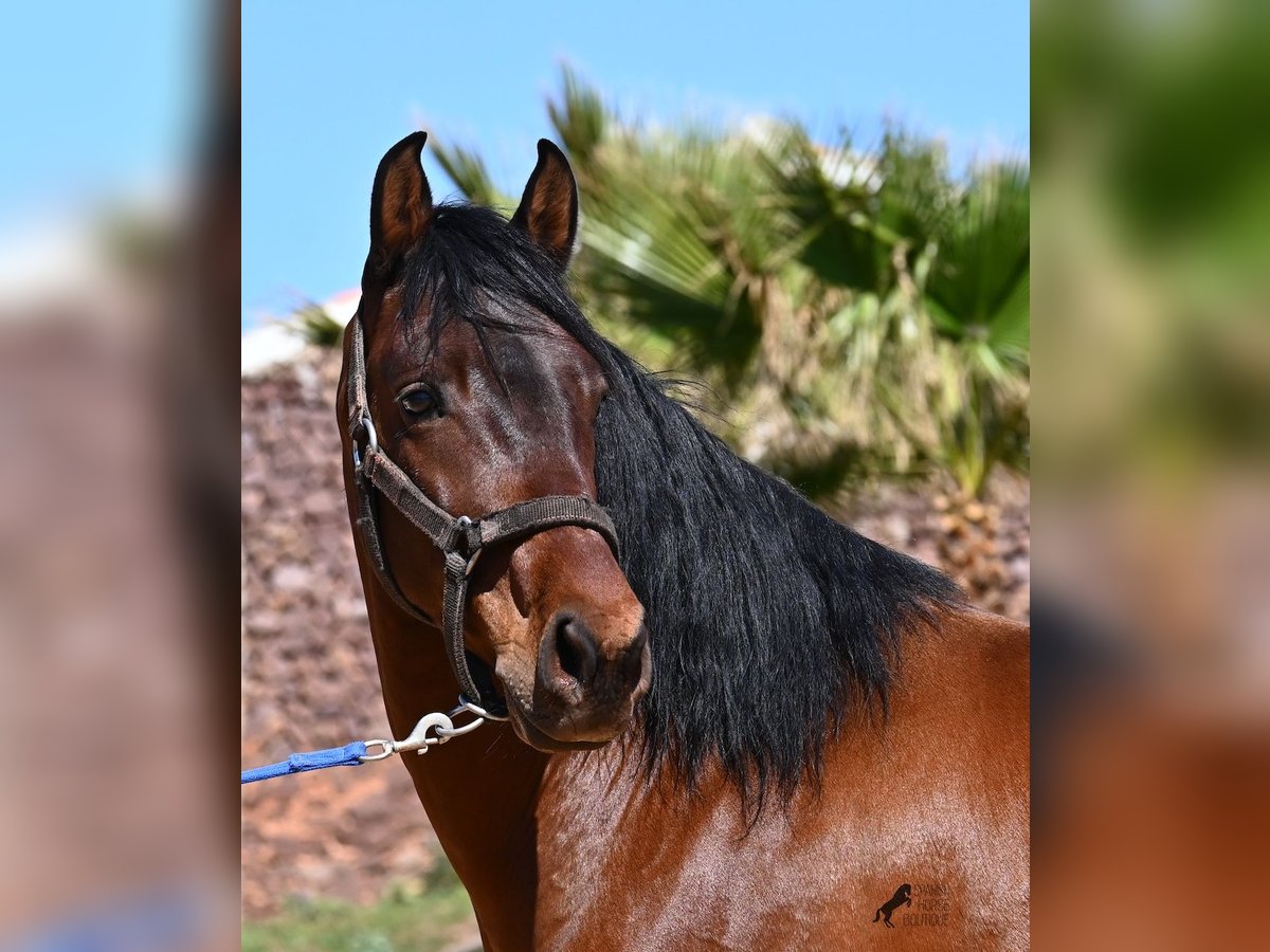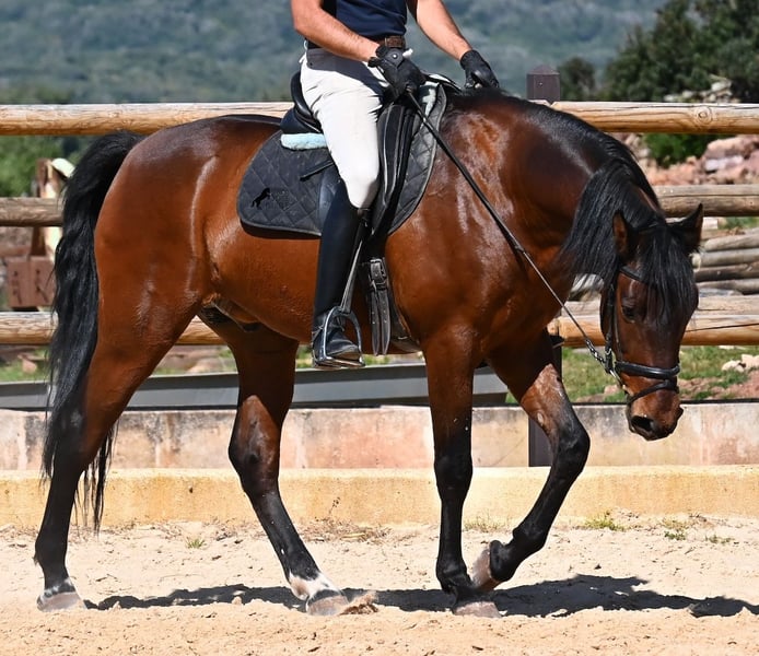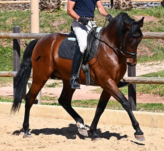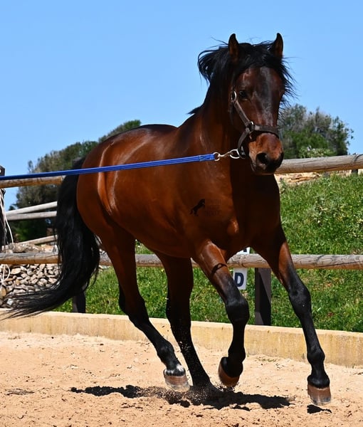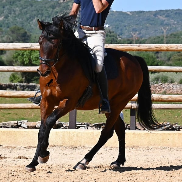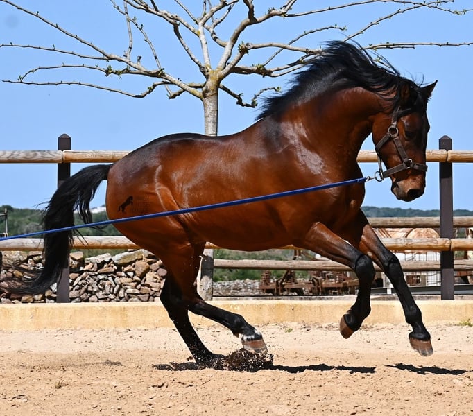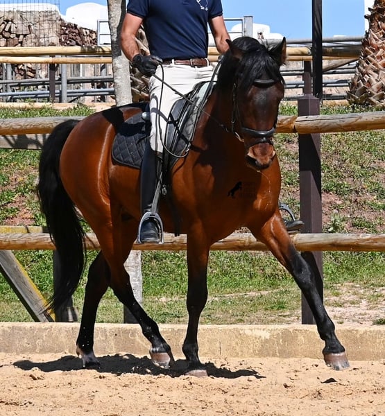 Dieser 2020 geborene, reinrassige PRE Hengst (Andalusier mit Rassenachweis der ANCCE), ist ein richtiges Powerpaket der nur so vor Elan bei der Arbeit strotzt! Er kommt von einem liebevollen Züchter, wo Spätentwickler wie die Spanier, das bekommen, was sie wirklich brauchen- Zeit! So ist er bis 3 in der Hengstherde komplett roh gestanden, wurde dann kurzzeitig aufgestallt, um die Basics zu lernen und dann wieder in den Urlaub entlassen, um alles mit Zeit zu verarbeiten. So hat er aktuell eine gute Basis unter dem Sattel, wo besonders darauf geachtet wird, dass er gut zu differenzieren lernt, zwischen seinem Vorwärtsdrang und Ruhephasen unter dem Reiter. Er lernt immer besser, sich selbst zu tragen, sich zu strecken und Ruhephasen zu verlängern, was sehr schön zu sehen ist. Ein Pferd, dass nicht in der Ausbildung gehetzt wurde, sondern sich erst finden darf und lernt die Energie zu lenken. Und Arbeitswillen hat er ohne Ende! Wo anderen schnell die Puste ausgeht, gibt er mehr und ist unermüdlich, womit er bestimmt ein Ideales Pferd für sehr ambitionierte Reiter ist, die gerne regelmäßig und gezielt trainieren. Geritten wird er auf doppelt gebrochener Wassertrense und ist nur an den Vorderhufen beschlagen. Nachts lebt er auf einem Hengstpaddock, was seinem Kopf auch sehr gut tut und tagsüber ist er in der Box für fürsorgliche Pflege und die korrekte Fütterung ist so besser garantiert. Ausritte auf dem hektargroßen Areal tun ihm auch gut und man merkt richtig, wie er da in seine Mitte findet, als positive Abwechslung zum Viereck. An leichten Arbeitstagen geht er in die Führmaschine und wird auch so weiter bemuskelt, ohne Gewicht zu tragen. In seiner Abstammung finden wir Ausnahmehengste wie YACO de TORRELUNA, ERMITAÑO III und sein Bruder ist sehr erfolgreich in der Dressur und hat es sogar zum SICAB (Weltmeisterschaft der PRE) geschafft. Er hat noch nicht gedeckt und kennt es, in der Nähe von Stuten zu sein, wobei die Option der Kastration vor Ort, selbstverständlich besteht. Aktuell misst er 157cm und hat ein schön barockes Exterieur, mit einem feinen Spanierkopf und guten Bewegungen, die ihn für viele Sparten mit hohem Arbeitsniveau interessant machen. Preiskategorie E! Sein Standort ist Menorca. Videos und Abstammung gerne auf Anfrage. Gerne organisiere ich vor Ort eine AKU, Beritt, Kastration, Transport oder auch ihre Reise, sollten Sie persönlich zum Anschauen kommen. Details dazu gerne auf meiner Seite oder im Gespräch. Saludos aus Spanien