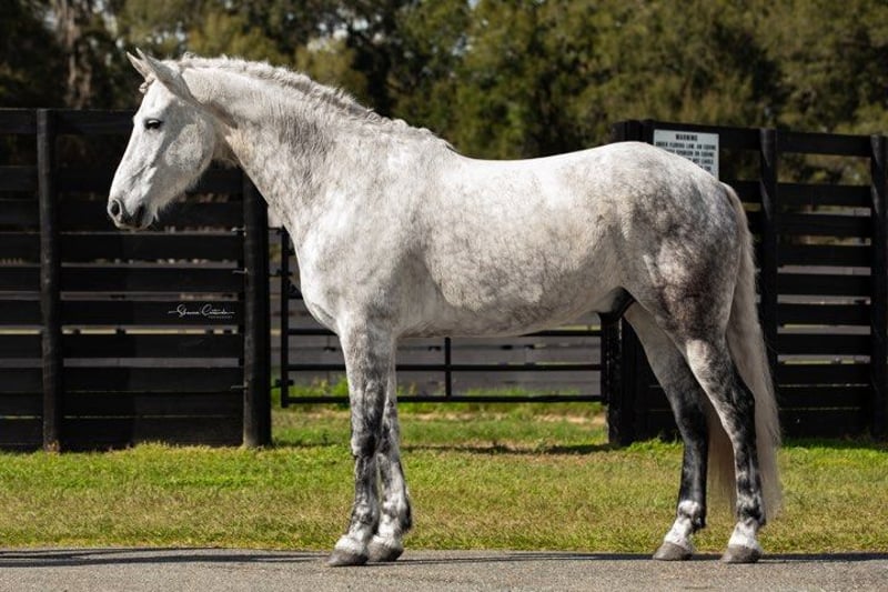 ONLINE AUCTION Place your bids at www.PlatinumEquineAuction.com Starting Bid $3500 Auction ends June 30th, 2024 Need a new saddle? Check out White Rock Saddles on our website or Facebook! Aladdin is a gorgeous grey 9yr Friesian x Andalusian gelding standing 16.1h. Aladdin trains in dressage and has been to several big shows including the World Equestrian Center. He has shown at training level and also schools leg yielding, shoulder-in, travers, reinback, turn on the haunches, simple changes, and collections and extensions within the gaits. Aladdin is a brave and curious horse, always well-mannered in new places. He cross trains in jumping, cross country, trail riding, and trail obstacle. He would be a great prospect for working equitation or eventing. Aladdin is a sweet boy with a big playful personality. Always a doll for grooming, bathing, tacking, clipping, etc. He is up-to-date on shots, Coggins, floating, deworming, sheath cleaning, and hoof trimming. If you have any questions about this beautiful dappled grey Friesian x gelding, please call Show Me Sport Horses Rachel 352-467-5695. Aladdin is located in Ocala, Florida and shipping can be arranged anywhere in the country. ONLINE AUCTION Place your bids at www.PlatinumEquineAuction.com Starting Bid $3500 Auction ends June 30th, 2024 Need a new saddle? Check out White Rock Saddles on our website or Facebook!
