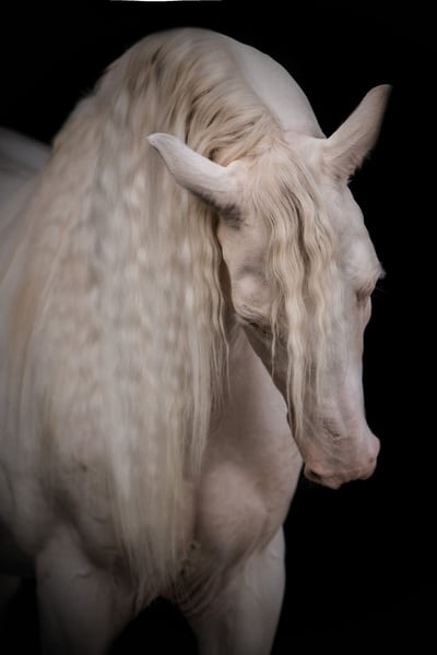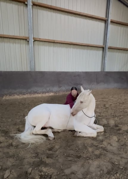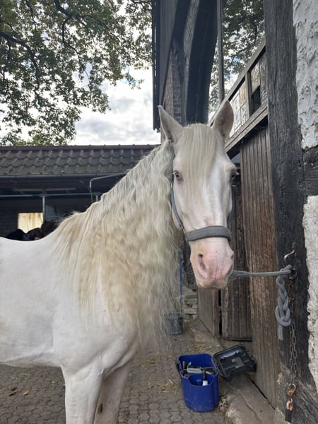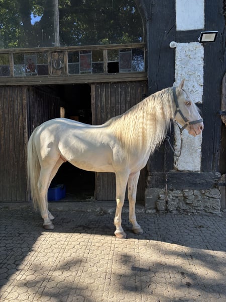 A true Spanish gentleman through and through, but also a bit of a joker and a prankster at times! Our stunning Hermano, in the special Cremello coat, is the perfect horse in every way. Beautiful, reliable, straightforward, and comfortable to ride with the finest aids, ridden bitless. Hermano masters the basic gaits, shoulder-in, leg-yield, traverses, rein-back, as well as a bit of piaffe and the Spanish walk. Naturally, he also understands the compliment, lies down on command, and can sit and laugh. In the herd, he tends to stay on the periphery. An excellent horse for leisure riding, dressage, and shows.