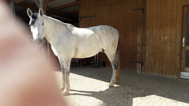 Met pijn in het hart bied ik mijn 1.66m lange, mooie, eerlijke Andalusische aan. Hij wordt in mei 10 jaar. Ik kocht het als een pure PRE. Zijn ouders hadden echter geen vergunning meer en dus kreeg hij 'slechts' Cruzado-papieren. Volgens de vorige eigenaar kreeg hij op jonge leeftijd een professionele vaquero-rit. Bij ons wordt hij alleen en in een groepje over het terrein en op het plein gereden. Wij zijn pure recreatieve ruiters. Toch is het niet geschikt voor beginners!!! Hij is makkelijk op de hulpmiddelen. Kan echter niet goed omgaan met druk. Bij het galopperen kan het opwarmen. Echt druk hebben we het echter niet. Hij werkt graag! Zijpassages en traversal shifts zijn voor hem geen probleem. Ook maakt hij in een oogwenk voorhand en achterhand. Helaas heeft hij zoenende stekels. Volgens de dierenarts mag zijn toekomstige ruiter niet meer dan 70 kg wegen. Daarnaast moet je altijd zorgen voor voldoende rugspieren en een geschikt zadel. Zo wordt het proces gestopt! Er zijn ook paarden in de sport die bij Kissing Spine horen, wat ik hem niet toewens. Het werd opgemerkt door een trainer die wees op zijn scheve staarthouding en zei dat ik voor de veiligheid röntgenfoto's moest laten maken om zijn training daarop aan te kunnen passen. Bij ons staat hij in een open stal. Ik zou dat graag nog eens voor hem zien. Het is absoluut geen noodverkoop! Dus geen "laatste prijs" verzoeken! Ook wordt het alleen ingeleverd als alles past. De ruitervaardigheden moeten aanwezig zijn! Hij zou het me sowieso laten zien op een proces! Voor de proefvoorbereiding sta ik mezelf toe om een bedrag van 25,- Euro in rekening te brengen. Ik hoop op deze manier hippisch toerisme te voorkomen! Als u nog vragen heeft, neem dan contact met ons op! De foto's doen hem niet echt recht en het is echt niet makkelijk voor mij om hem op te geven. Het charisma onder het zadel wordt mooier met de vaardigheid van de ruiter ,-)