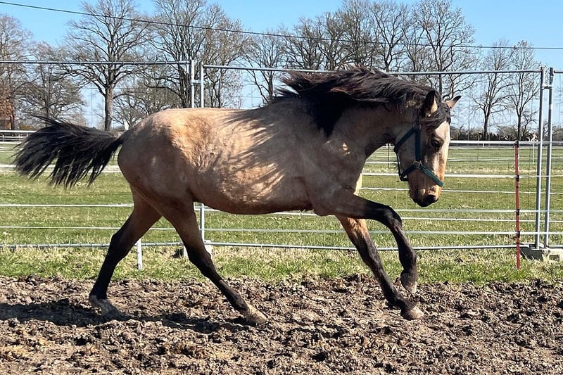 Gold Boy with a Taste for Adventure Seeks a Partner This 3-year-old Andalusian-Lusitano gelding in the charming rare color of buckskin knows exactly: looking good is one thing – having character is another. And he can do both. Raised in a small, high-quality breeding program, he has neither box stall neurosis nor bad manners. Instead: 24/7 herd life, plenty of movement on spacious, hilly terrain, providing the perfect foundation for strong nerves, stable legs, and a clear mind. His bloodlines reliably deliver what one wishes for (and what is unfortunately not always a given): 🧠 Thinks along 🦁 Brave but not reckless ❤️ Eager to work 🤝 Maintains friendliness 💪 Endures longer sessions This young gentleman is now ready to start his career and is looking for someone to show him how exciting life as a riding horse can be. Possible disciplines? Almost anything that’s fun: Western, English, dressage, working equitation, trail riding, endurance riding – he’s open to new opportunities and learns quickly. Summary: A golden-colored rough diamond that hasn’t been “taught” to break, works instead of arguing, and will surely become the type of horse you say: “I’d never want to part with him.” ✨🐎