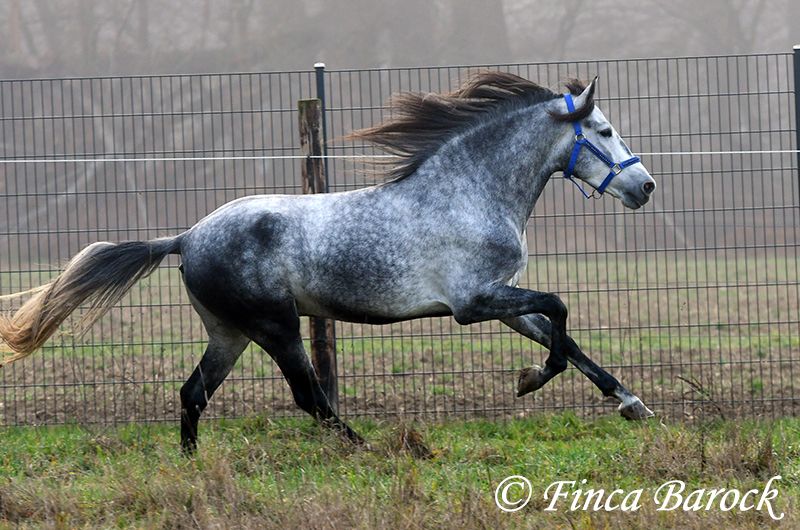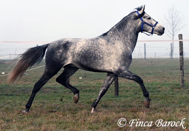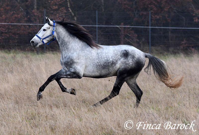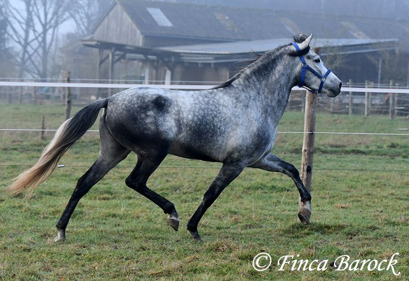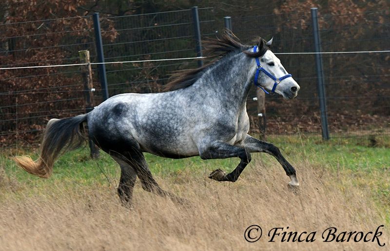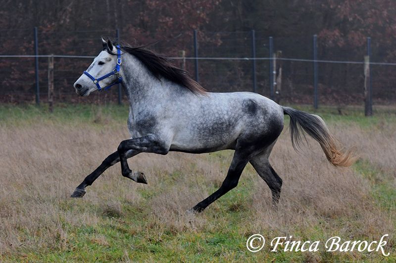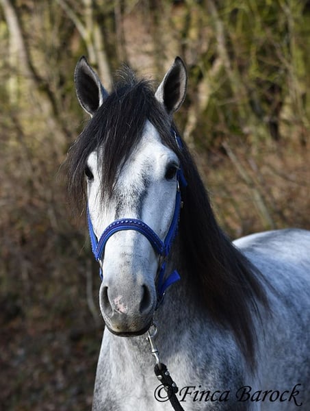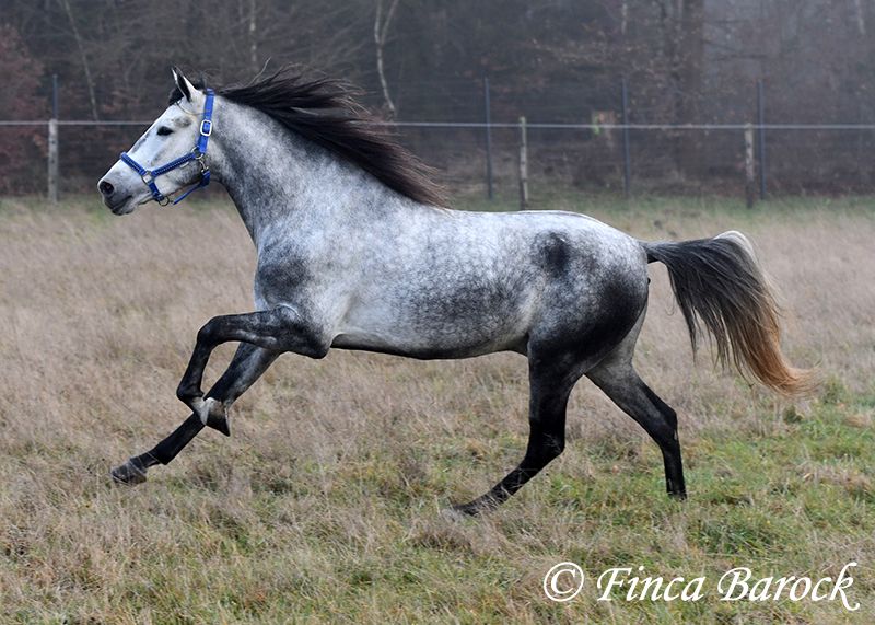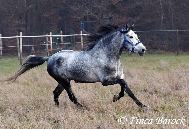 Rasse: Andalusier Name: Espartano Geschlecht: Wallach Stockmaß: 156 cm Alter: 21.11.2021 Farbe: Schimmel Preis: 9500 € Vater: o. P. Mutter: o. P. Espartano, ein echter Hingucker mit sehr sanftem, freundlichem Charakter. Espartano ist im November 4 Jahre alt geworden. Er bringt bereits jetzt eine hohe Grundcoolness mit und liebt Schmuseeinheiten. Espartano ist solide in den GGA geritten. Er kennt mehr Gelände als Viereck und lernt aktuell bei uns mehr Routine im Viereck kennen. Er zeigt sich auch unter etwas unsicheren Reiter ausgesprochen anständig und wohlwollend. Draußen erleben wir Ihn ausgesprochen gelassen, egal ob bellende Hund am Zaun, Fahrradfahrer oder Autobahnbrücke – Espartano nimmt die neuen Dinge war, lässt sich aber schnell überzeugen das alles normal ist. Dazu hat er sitzbequeme Bewegungen und vermittelt einfach ein klasse Reitgefühl! Ein toller, kompakter Bub, mit unglaublich freundlichem Blick und toller Halsung. Er steht noch voll in der Entwicklung und wird noch weiter Auslegen und etwas Wachsen. inkl. klinischer tierärztlicher Untersuchung und Röntgenbildern Kontakt: Finca Barock, Tel. 0173-696 31 81, 56291 Wiebelsheim
