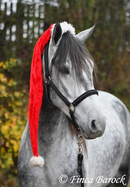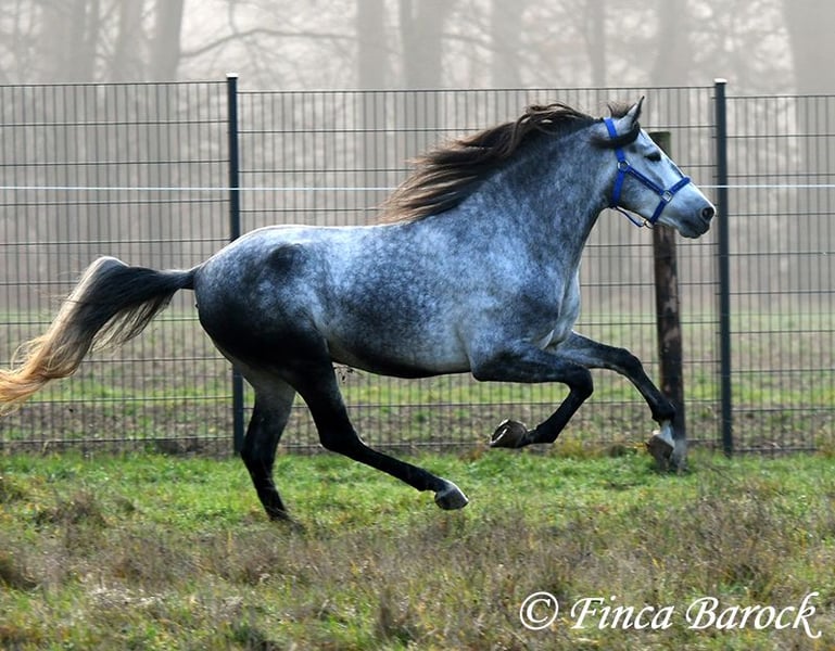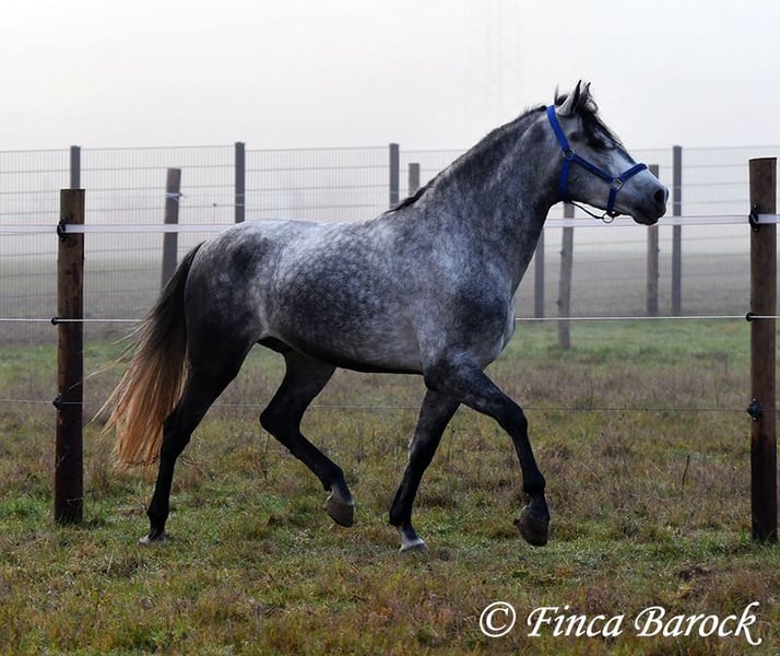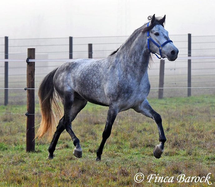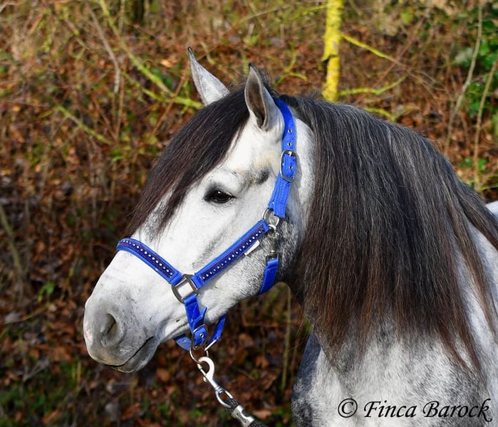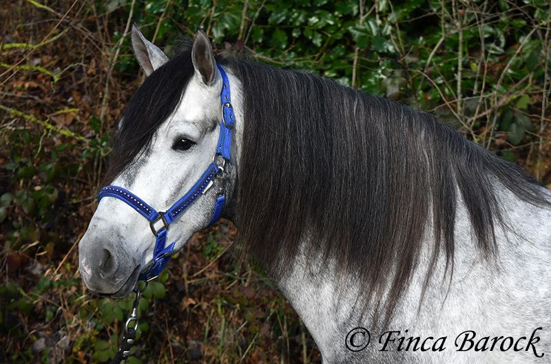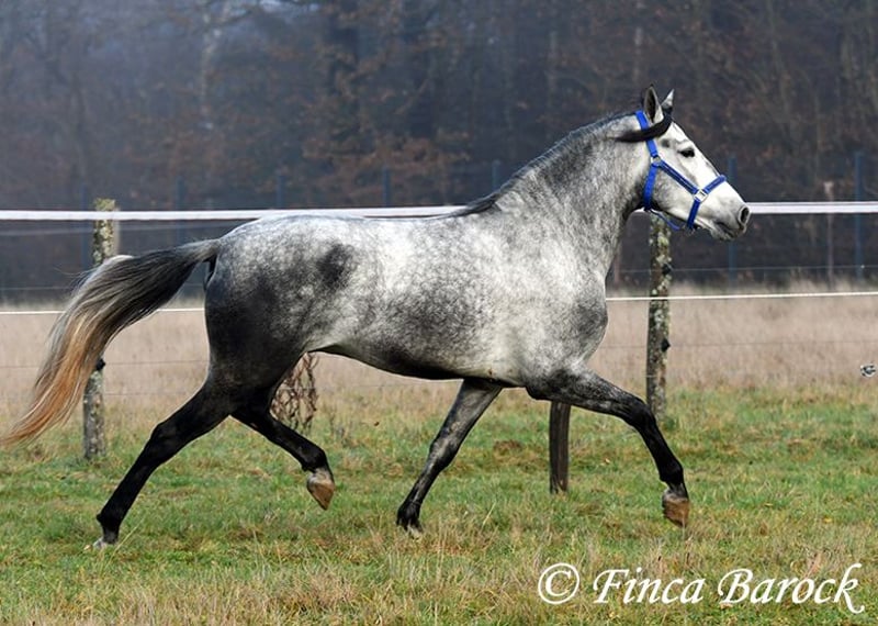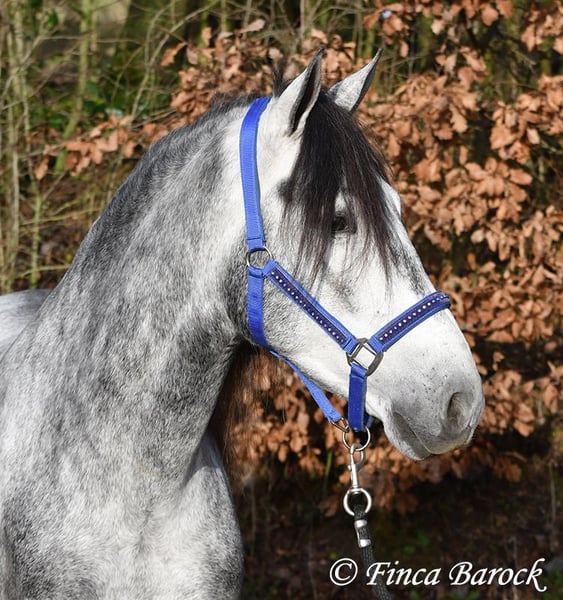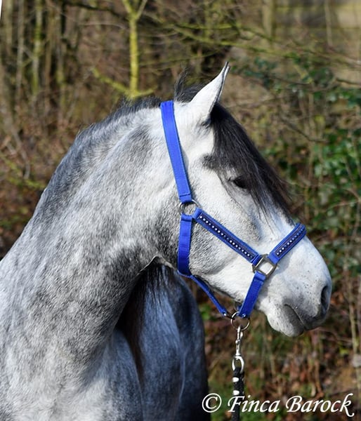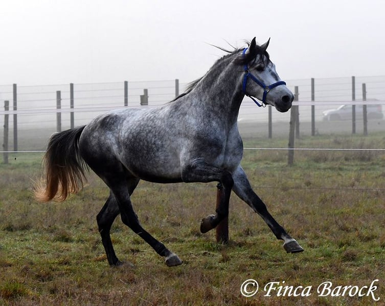 Rasse: Andalusier Name: Espartano Geschlecht: Wallach Stockmaß: 156 cm Alter: 21.11.2021 Farbe: Schimmel Preis: 9500 € Vater: o. P. Mutter: o. P. Espartano, ein echter Hingucker mit sehr sanftem, freundlichem Charakter. Espartano ist im November 4 Jahre alt geworden. Er bringt bereits jetzt eine hohe Grundcoolness mit und liebt Schmuseeinheiten. Espartano ist solide in den GGA geritten. Er kennt mehr Gelände als Viereck und lernt aktuell bei uns mehr Routine im Viereck kennen. Er zeigt sich auch unter etwas unsicheren Reiter ausgesprochen anständig und wohlwollend. Draußen erleben wir Ihn ausgesprochen gelassen, egal ob bellende Hund am Zaun, Fahrradfahrer oder Autobahnbrücke – Espartano nimmt die neuen Dinge war, lässt sich aber schnell überzeugen das alles normal ist. Dazu hat er sitzbequeme Bewegungen und vermittelt einfach ein klasse Reitgefühl! Ein toller, kompakter Bub, mit unglaublich freundlichem Blick und toller Halsung. Er steht noch voll in der Entwicklung und wird noch weiter Auslegen und etwas Wachsen. inkl. klinischer tierärztlicher Untersuchung und Röntgenbildern Kontakt: Finca Barock, Tel. 0173-696 31 81, 56291 Wiebelsheim