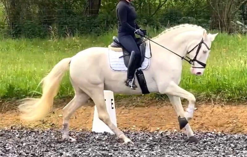 . 8 yo, 16h (162cm). PSL crossbred, easy to handle for any type of rider. Spectacular physique, baroque, and healthy. With a dressage level of lateral exercises and flaying changes in series. A with many qualities . horse for dressage, working equitation or leisure riding.