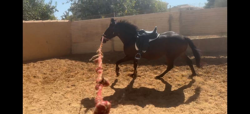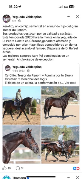 AMARANTO DS, AA (15,08 %) – Genética contrastada para el deporte Se ofrece Amaranto DS, joven Anglo-árabe nacido en 2023, fruto de un cruce muy bien pensado y equilibrado, orientado claramente al Concurso Completo y disciplinas deportivas exigentes. Es hijo de Xerófito, semental único y de gran proyección, descendiente directo del prestigioso Tresor du Renom, una de las líneas más fiables del Anglo-árabe moderno por calidad funcional, carácter y transmisión deportiva. Esta línea paterna está plenamente avalada por resultados: Ufano CP, hermano de padre de Amaranto DS, ha sido Campeón de España de Completo con solo 6 años, demostrando precocidad, mentalidad competitiva y enorme proyección. Por línea materna, Labina (PSI) aporta sangre pura de alto nivel, resistencia y calidad atlética. Labina es hija de Trajano (USA), descendiente directo de Elusive Quality, línea reconocida por velocidad, motor y equilibrio, y de Eurobetis, por Sorcerous (GB), hijo de Sadler’s Wells, una de las grandes referencias mundiales en fondo, clase y capacidad de trabajo. Esta combinación PSI refuerza notablemente la resistencia, el tranco y la cabeza, cualidades esenciales para el completo moderno. AMARANTO DS, AA (15.08%) – Proven genetics for sport Amaranto DS is offered for sale, a young Anglo-Arab born in 2023, the result of a very well-planned and balanced cross, clearly oriented toward Eventing and demanding sport disciplines. He is sired by Xerófito, a unique stallion with great projection, a direct descendant of the prestigious Tresor du Renom, one of the most reliable lines in the modern Anglo-Arab breed for functional quality, character, and sporting transmission. This paternal line is fully supported by results: Ufano CP, a paternal half-brother to Amaranto DS, was Spanish Eventing Champion at just 6 years old, demonstrating precocity, competitive mentality, and outstanding potential. On the maternal side, Labina (Thoroughbred) contributes top-level pure blood, stamina, and athletic quality. Labina is by Trajano (USA), a direct descendant of Elusive Quality, a line renowned for speed, engine, and balance, and out of Eurobetis, by Sorcerous (GB), a son of Sadler’s Wells, one of the world’s great references for stamina, class, and work capacity. This Thoroughbred combination significantly reinforces endurance, stride, and mental strength, essential qualities for modern eventing. AMARANTO DS, AA (15,08 %) – Bewährte Genetik für den Sport Zum Verkauf steht Amaranto DS, ein junger Anglo-Araber, geboren 2023, hervorgegangen aus einer sehr durchdachten und ausgewogenen Anpaarung, klar ausgerichtet auf den Vielseitigkeitssport (Eventing) und anspruchsvolle Disziplinen. Er ist ein Sohn von Xerófito, einem einzigartigen Hengst mit großer Perspektive, direkter Nachkomme des renommierten Tresor du Renom, einer der zuverlässigsten Linien des modernen Anglo-Arabers in Bezug auf funktionelle Qualität, Charakter und sportliche Vererbung. Diese väterliche Linie ist durch Ergebnisse eindeutig bestätigt: Ufano CP, väterlicher Halbbruder von Amaranto DS, wurde Spanischer Meister der Vielseitigkeit im Alter von nur 6 Jahren und zeigte dabei Frühreife, Wettkampfmentalität und enormes Potenzial. Mütterlicherseits bringt Labina (Vollblut) erstklassiges Vollblut, Ausdauer und athletische Qualität ein. Labina ist eine Tochter von Trajano (USA), einem direkten Nachkommen von Elusive Quality, einer Linie, die für Schnelligkeit, Motor und Balance bekannt ist, und aus Eurobetis, von Sorcerous (GB), einem Sohn des legendären Sadler’s Wells, einer der weltweit bedeutendsten Referenzen für Ausdauer, Klasse und Leistungsbereitschaft. Diese Vollblutkombination stärkt deutlich Ausdauer, Galoppade und mentale Stärke, alles entscheidende Eigenschaften für den modernen Vielseitigkeitssport.