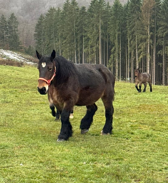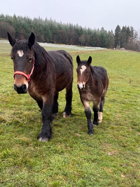 For sale is a 12-year-old (born May 2013) Luxembourg Ardennes broodmare, approximately 1.60 m tall, with excellent pedigree. She has already produced several beautiful foals and is very easy to handle. She was covered by a stallion again this year and was confirmed pregnant at her last check-up. Breeding certificate available, of course. She has a good conformation and also moves nicely. She has always been healthy and is a good mother. Her current foal will be weaned soon or can be purchased together with her. She is very trusting and completely well-behaved in handling. Loading and transport pose no problem. She can be kept robustly. No known illnesses or allergies. An ultrasound examination (AKU) can be performed upon request. Please call or send a message to 0157 36803742. All information provided is without guarantee, subject to price changes. Transport possible, online purchase available.