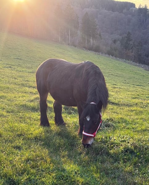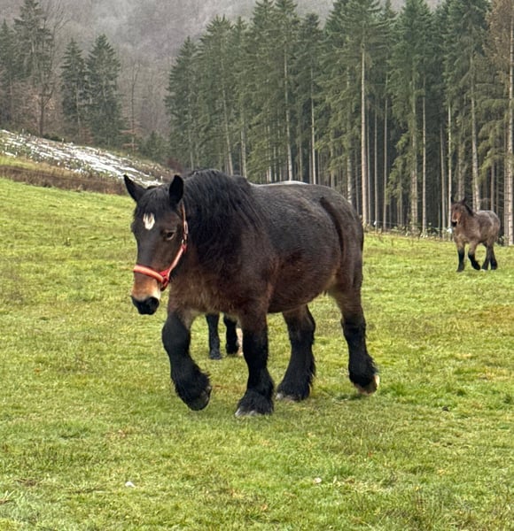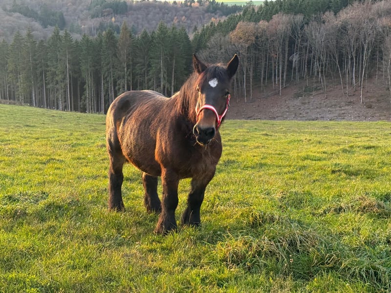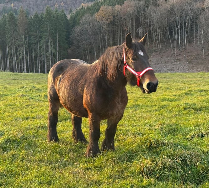 Zum Verkauf steht eine 12 Jahre alte (05.2013), etwa 160cm große Luxemburger Ardenner Zuchtstute mit sehr guter Abstammung. Sie hatte schon mehrere sehr schöne Fohlen und nimmt immer gut auf. Sie stand auch in diesem Jahr wieder beim Hengst und war bei der letzten Kontrolle tragend. Deckschein liegt natürlich vor. Sie hat ein gutes Gebäude und zeigt auch schöne Bewegung. Bisher war sie immer gesund und eine gute Mutter. Ihr aktuelles Fohlen wird bald abgesetzt oder kann auch mit gekauft werden. Sie ist sehr zutraulich und absolut brav im Händling. Verladen usw. kein Problem. Sie kann robust gehalten werden. Krankheiten oder Allergien sind nicht bekannt. Eine AKU darf gerne gemacht werden. Gerne anrufen oder eine Nachricht senden 0157 36803742 Alle Angaben ohne Gewähr, Preisänderungen vorbehalten, Transport möglich, Onlinekauf möglich