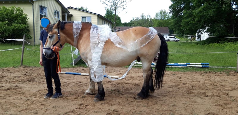 Jurand is an 11-year-old cold-blooded gelding bred in Poland, currently used in our behavioral and riding therapy programs. He is very social and approaches all people confidently. Within the herd, he holds a high ranking. Jurand is calm under pressure and eager to learn. He also picks up on things he doesn’t necessarily need to know (e.g., opening gate latches...). Due to his solid build, he makes an impressive impression. He has experience with many people and sometimes exploits "authority gaps" (e.g., stopping, eating, or turning towards the pasture). He requires an experienced horse person who can anticipate such antics and intervene accordingly. However, he also reliably stands still if an inexperienced rider is uncertain, waiting patiently until it’s safe to continue. Despite his strong stature, he can canter on both leads and has learned to respond to subtle aids. Jurand has developed a moderate summer eczema, but he has no other health issues.