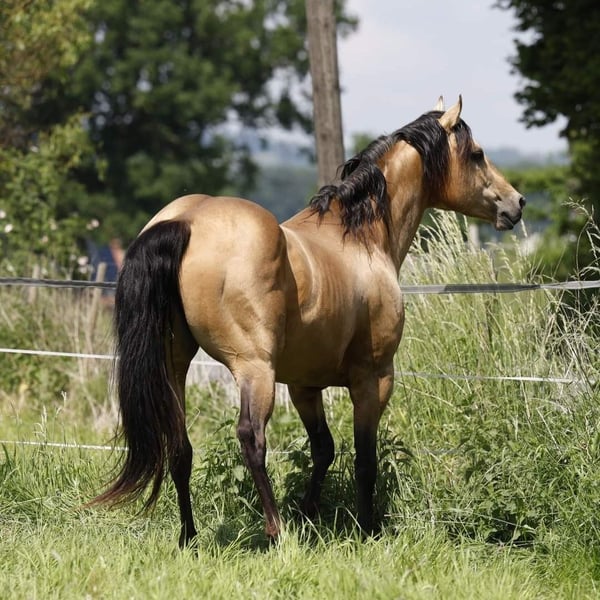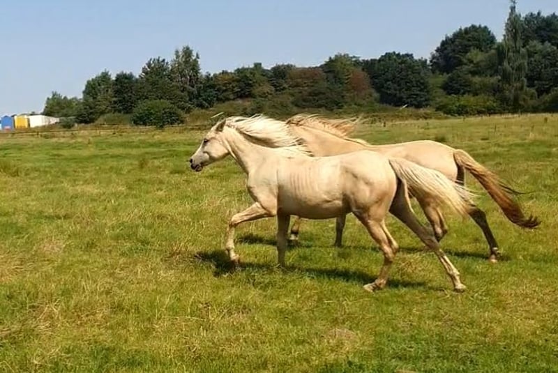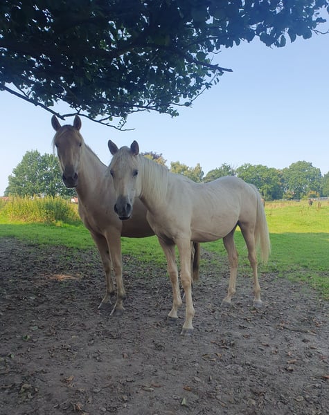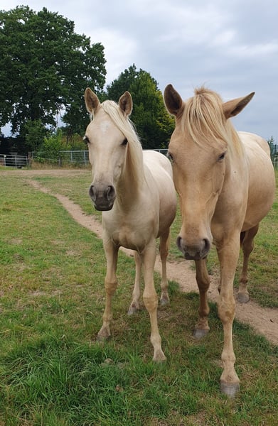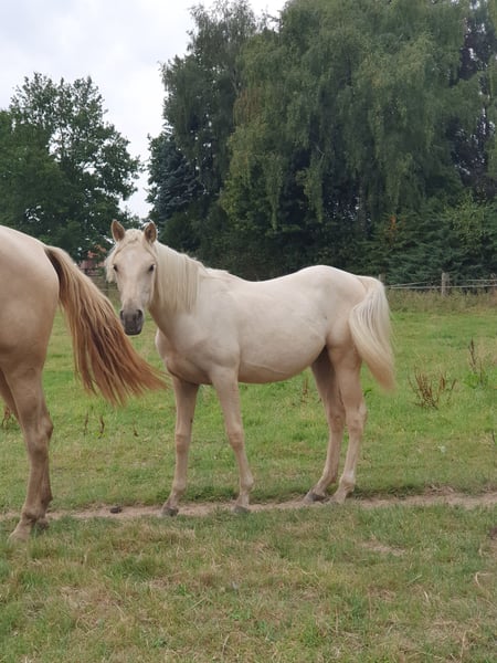 Our wonderful one-year-old Azteca mare from our own breeding is looking for a 5* home. Chexy impresses not only with her beauty but also with her wonderfully balanced and calm temperament. She is super brave, curious, and very interested in people. Additionally, she is completely unflappable and simply lovely to handle. Her curiosity and gentle nature make her an ideal future partner for all areas of recreational riding, Western classes, or Working Equitation. She has the potential to shine in many disciplines. Chexy is used to growing up in a herd, is well-socialized and mineralized. She is not familiar with box stalls and will not be placed there. Of course, she is farrier-friendly and loadable and already knows basic groundwork. We are looking for a person who will spend time with her and fully develop her potential. She will receive papers from AAHIA and of course has an equine passport. Key data: Breed: Azteca Gender: Mare Age: 1 year Color: Palomino Character: Calm, balanced, curious, unflappable Height: approx. 1.58 m The last two photos show the parents. Mother: PRE, Father: QH with old blood (Doc Chex)