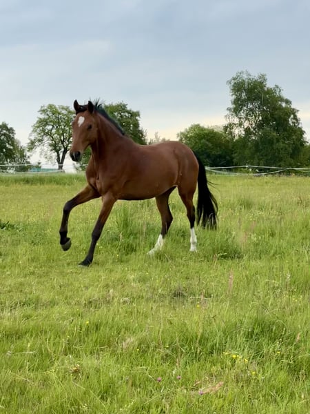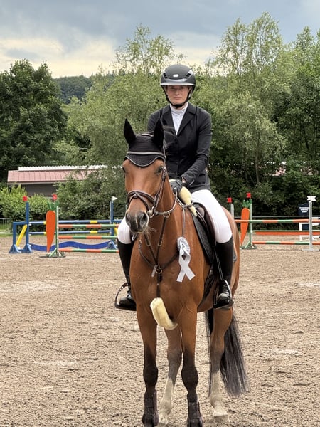 I am offering an 8-year-old mare – a strong-charactered, spirited, and very people-oriented mare who is reliable and friendly in daily handling. She is social in a herd environment, curious, and sensitive to her person. In the field, she is well-behaved and secure, whether alone or in a group. She reacts calmly to traffic. She also impresses in jumping with caution and overview. She is kept barefoot and manages this very well. Loading is no problem for her – she enters the trailer on her own and travels calmly and relaxed. There is a veterinary report available that significantly reduces her price, but it does not bring any restrictions in use or capacity. She is healthy, willing to perform, and shows no abnormalities in daily life. For her, I wish for a home with plenty of turnout, social contact, and loving care. She belongs in hands that appreciate her temperament and provide her with the necessary movement and attention. Whoever is looking for a versatile, honest, and loyal partner will find a very special horse in her.