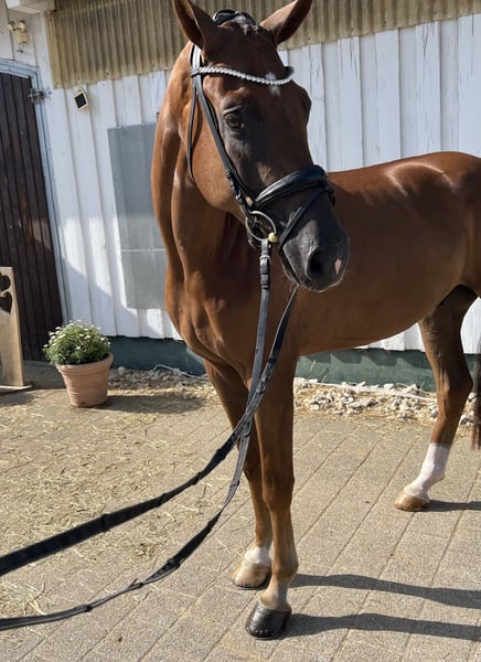 Dieser wunderschöne Sohn des Feinrich macht einfach nur Spaß. Er ist wahnsinnig ausgeglichen und lieb im Umgang so wie beim reiten. Er ist sehr leichtrittig und unkompliziert, mit genügend Go aber immer gut händelbar. Er hat einen sehr schwungvollen Trab, der nicht aus dem Takt zu bringen ist und sehr angenehm zu sitzen ist. Sein fleißiges Hinterbein macht ihm das galoppieren leicht und man spürt, dass die Versammlung kein Problem für ihn darstellt. Der Schritt wird im laufe der Ausbildung immer raumgreifender und gewinnt mehr an Boden. Diesem Pferd steht mit seiner Einstellung und seinen Möglichkeiten nichts im Wege … Aktueller guter tüv vorhanden. Bei Interesse gerne unter 01725624754 melden