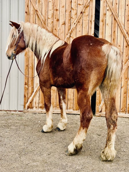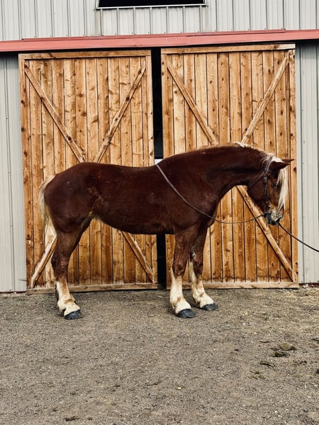 "AVAILABLE ON ONLINE HORSE AUCTION AT www DOT MagicHorseAuction DOT com BIDDING OPEN NOW thru TUESDAY | MARCH 31st! BUY IT NOW AVAILABLE! *Final price will be determined on auction site* CONSIGNOR CONTACT INFO: Dynamite horses #970-632-3644 LOCATION: fort Collins, CO " "Freedom 🇺🇸 Freedom is a 5-year-old, 18.2 hand Belgian mare with an absolute heart of gold. She truly is what dreams are made of—from her incredible disposition and sweet, kind personality to her willing attitude and striking looks. This mare turns heads everywhere she goes and has the temperament to match her beauty. Freedom has been exposed to all aspects of trail life, from mountain rides to town riding. She confidently rides alongside bikes, strollers, runners, and heavy traffic without hesitation. She has passed semis without flinching, crossed bridges, gone under tunnels, and walked straight through rivers like it’s nothing. She’s steady, reliable, and takes everything in stride. Not only is Freedom a trail pro, but she also has a solid foundation in the arena. She has a smooth, comfortable walk, jog, and lope, and works beautifully off your voice. She stops off your seat and voice cues and is incredibly thoughtful—she’s even learned to stop and wait if you lose your balance, giving you time to regain your seat. Freedom is well-mannered and easy to handle. She lowers her head willingly for the halter and bridle and will side-pass to the mounting block, standing patiently while you get on. She goes barefoot with strong, solid feet and handles farrier work like a pro, even without stocks. She picks up her feet easily and stands quietly. On the ground, Freedom is just as special. She stands to be brushed and loved on, ties quietly for as long as needed, and genuinely enjoys attention. She has also been exposed to flags, tarps, and the beginning stages of collection work. She rides both English and Western and looks beautiful doing either. If you’re looking for a dependable, kind-hearted mare with both brains and beauty, Freedom is one you don’t want to miss. Come see this incredible mare for yourself—you’ll fall in love with her just as we have! "