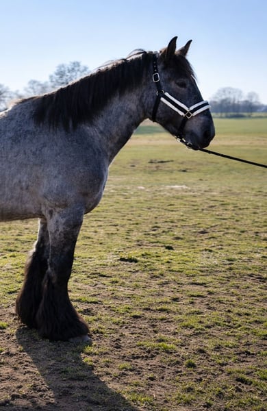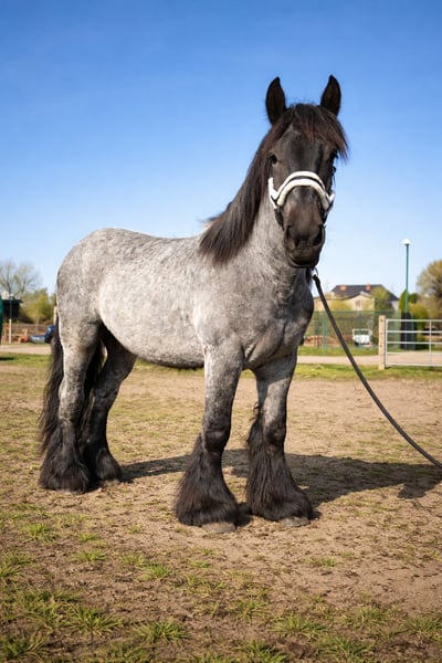 1.5-year-old Belgian Draft cross gelding in a rare blue color. With original Belgian pedigree papers. Very balanced, friendly temperament, people-oriented and calm. He has a strong, breed-typical draft build, developmentally appropriate for his age. A beautiful young horse with great potential for carriage driving and forest work. Thanks to his calm, balanced nature, he is also suitable for leisure riding, therapy, and future riding activities. He is farrier- and loading-friendly. Additionally, he is regularly vaccinated and dewormed. Currently stands at 15.8 hh.