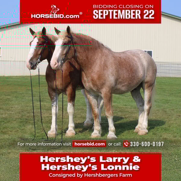 🍁𝒕𝒉𝒆 𝐅𝐀𝐋𝐋 𝑺𝒑𝒆𝒄𝒕𝒂𝒄𝒖𝒍𝒂𝒓🍁 Happening now thru MONDAY | SEPTEMBER 22nd - Available EXCLUSIVELY on HorseBid's website! For more details and to register visit: www.Horsebid.com CONSIGNOR CONTACT: Hershbergers Farm 330-600-0197 LOCATION: Millersburg, OH BREED: Belgian X Clydesdale REGISTERED: No COLOR: Red Roan HEIGHT: 17.3 AGE: 6 GENDER: Gelding Hershey's Larry and Hershey's Lonnie are a once in a lifetime find. Here is a team of 5 and 6 year old full brothers that check all the boxes. Larry and Lonnie have been together all their life as we got them from the farm where they were raised at. They are the type of team that if you can't drive them you'd better stick with a tractor. They have been through parades and out in heavy traffic a lot and absolutely nothing faces them. Larry and Lonnie have been in all types of farm equipment, anything from the liquid fertilizer sprayer, plow, manure spreader, pulling logs out of the woods. Here is a team that is broke the best and anyone can drive them but they are also not too lazy to be useful around the farm. They will stand nice when you get off the wagon to open the gates and when loading manure they don't mind the loud tractor. Larry and Lonnie also don't mind driving single or going out on a trail ride alone. They have been driven on either side of the tongue and tantom in front of each other. They are very easy to back up and swing on Gee and Haa commands. After they're done working it is very easy to back the wagon right onto the barn. Larry and Lonnie have done about anything here on the farm from working in farm equipment, to giving rides in the merry-go-round, to meeting kids in the petting area. They get along great with other animals in the pasture and will walk up to you when you go out to bring them in. Here is a team that will fit for the whole family and if you like to have something a little different from anyone else, here something you just don't find everyday!! To learn more about Larry and Lonnie call or text John @ 330-600-0197