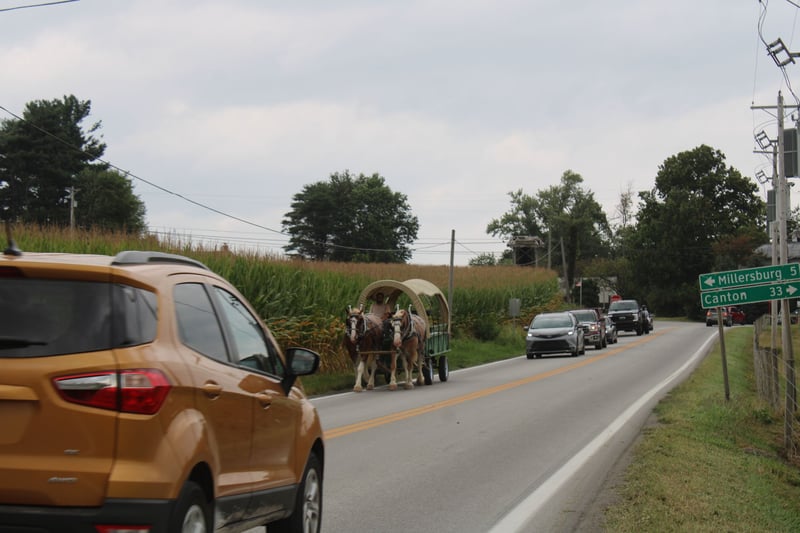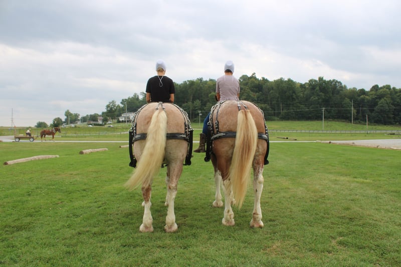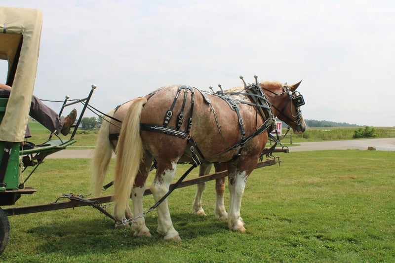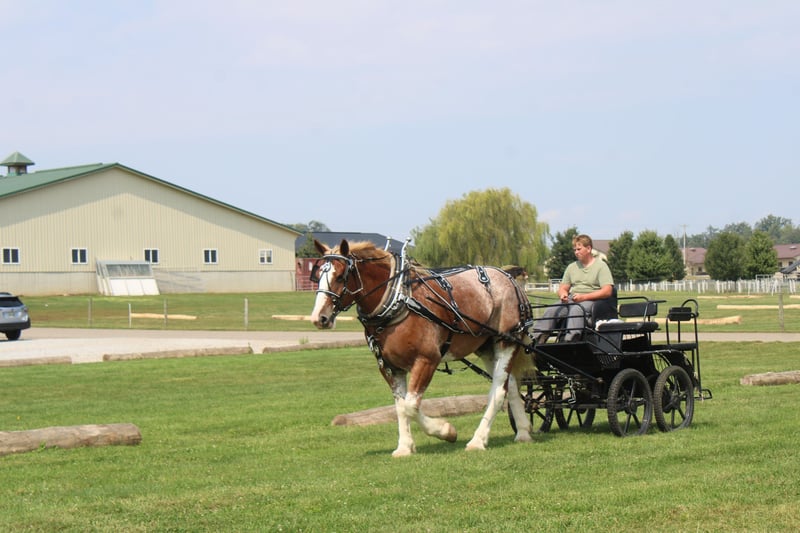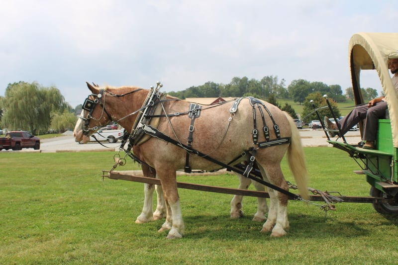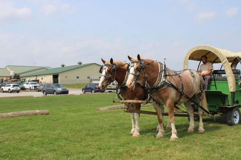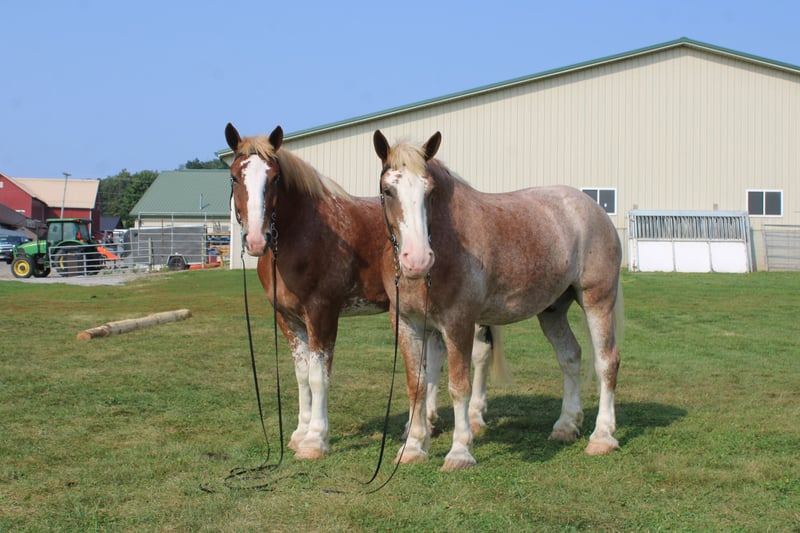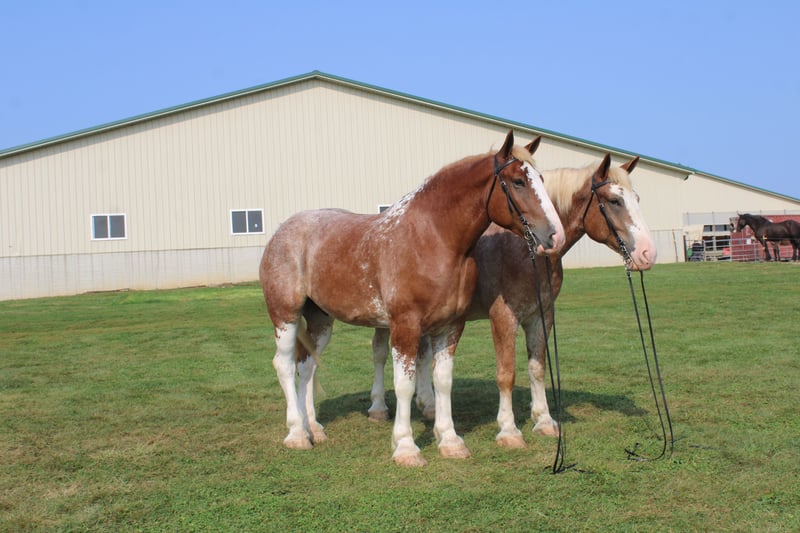 🍁𝒕𝒉𝒆 𝐅𝐀𝐋𝐋 𝑺𝒑𝒆𝒄𝒕𝒂𝒄𝒖𝒍𝒂𝒓🍁 Happening now thru MONDAY | SEPTEMBER 22nd - Available EXCLUSIVELY on HorseBid's website! For more details and to register visit: www.Horsebid.com CONSIGNOR CONTACT: Hershbergers Farm 330-600-0197 LOCATION: Millersburg, OH BREED: Belgian X Clydesdale REGISTERED: No COLOR: Red Roan HEIGHT: 17.3 AGE: 6 GENDER: Gelding Hershey's Larry and Hershey's Lonnie are a once in a lifetime find. Here is a team of 5 and 6 year old full brothers that check all the boxes. Larry and Lonnie have been together all their life as we got them from the farm where they were raised at. They are the type of team that if you can't drive them you'd better stick with a tractor. They have been through parades and out in heavy traffic a lot and absolutely nothing faces them. Larry and Lonnie have been in all types of farm equipment, anything from the liquid fertilizer sprayer, plow, manure spreader, pulling logs out of the woods. Here is a team that is broke the best and anyone can drive them but they are also not too lazy to be useful around the farm. They will stand nice when you get off the wagon to open the gates and when loading manure they don't mind the loud tractor. Larry and Lonnie also don't mind driving single or going out on a trail ride alone. They have been driven on either side of the tongue and tantom in front of each other. They are very easy to back up and swing on Gee and Haa commands. After they're done working it is very easy to back the wagon right onto the barn. Larry and Lonnie have done about anything here on the farm from working in farm equipment, to giving rides in the merry-go-round, to meeting kids in the petting area. They get along great with other animals in the pasture and will walk up to you when you go out to bring them in. Here is a team that will fit for the whole family and if you like to have something a little different from anyone else, here something you just don't find everyday!! To learn more about Larry and Lonnie call or text John @ 330-600-0197