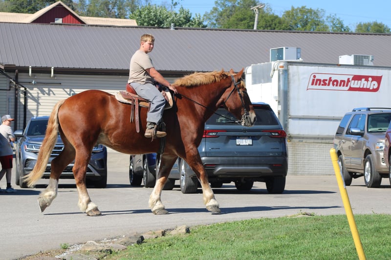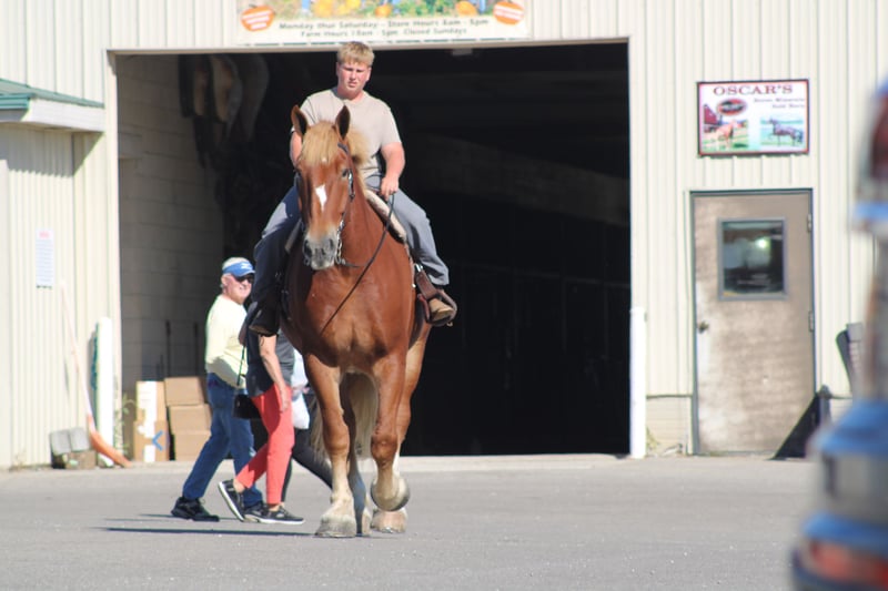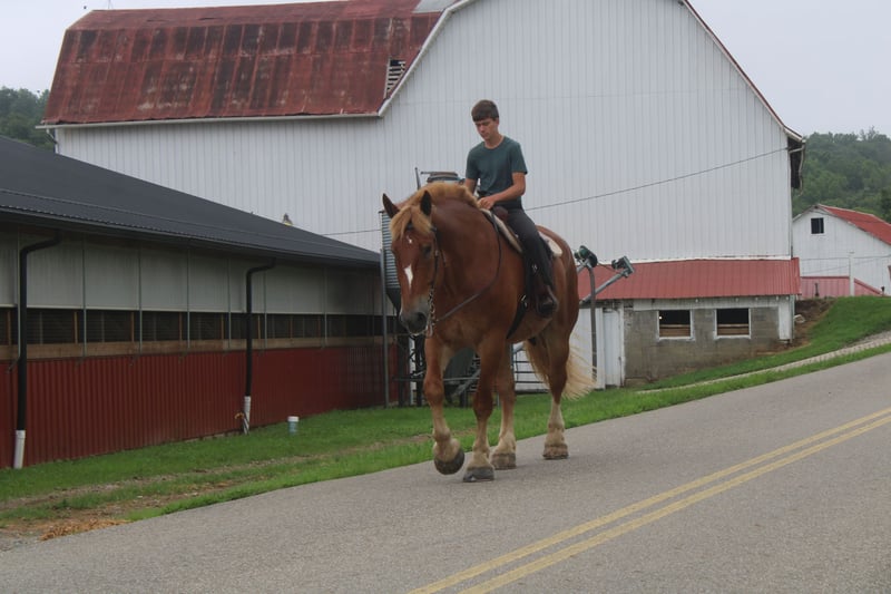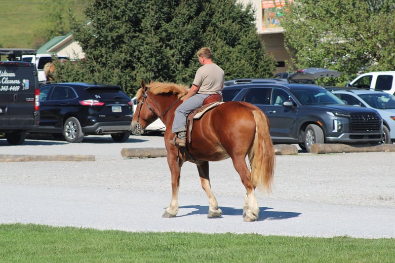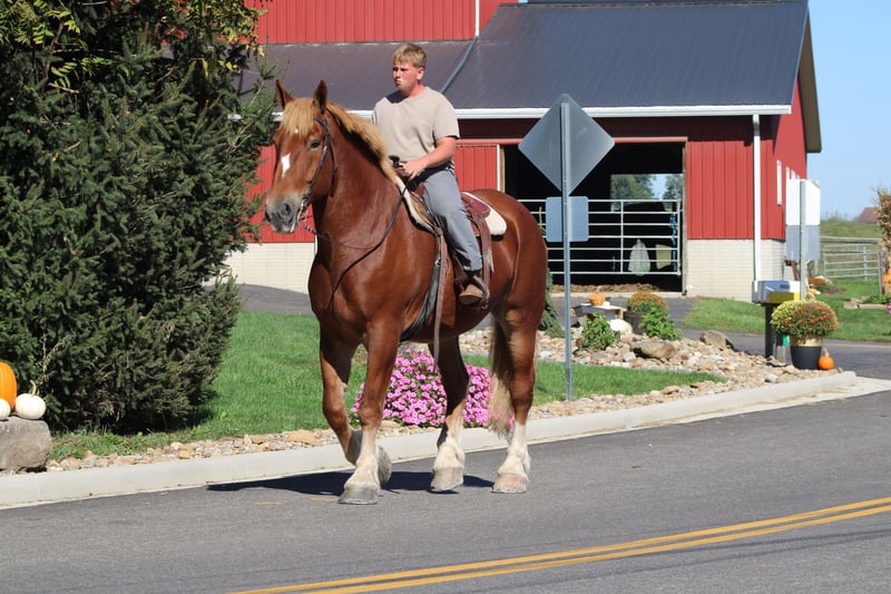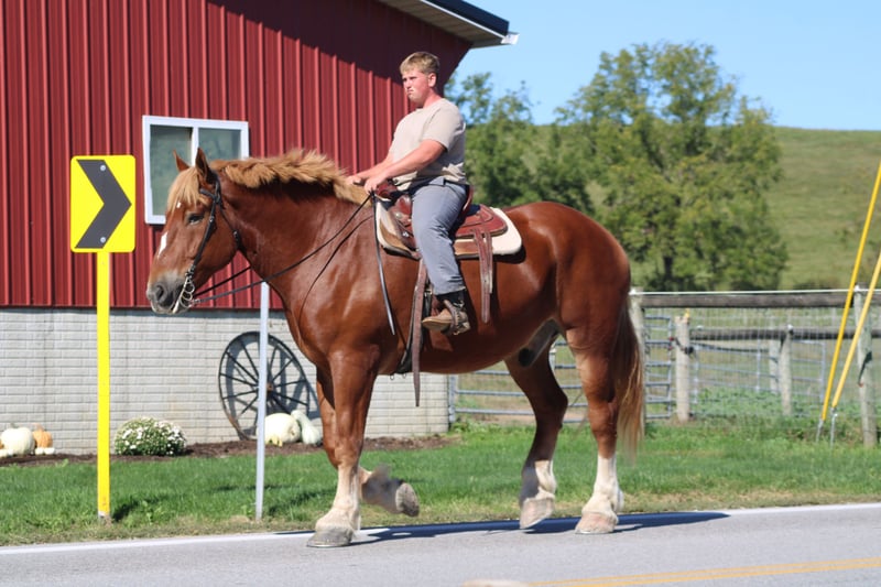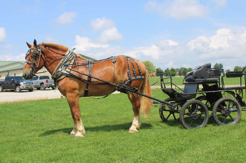 ♦️ 𝐭𝐡𝐞 𝐀𝐌𝐄𝐑𝐈𝐂𝐀𝐍 𝓕𝓪𝓵𝓵 𝓒𝓵𝓪𝓼𝓼𝓲𝓬 ♦️ Happening now thru MONDAY | OCTOBER 20th - Available EXCLUSIVELY on HorseBid's website! For more details and to register visit: www.Horsebid.com CONSIGNOR CONTACT: Hershberger's Farm 330-600-0197 LOCATION: Millersburg, OH BREED: Belgian REGISTERED: No COLOR: Sorrel HEIGHT: 17.3 AGE: 8 GENDER: Gelding Hershey's George is an 8 year old Belgian gelding. Here is an absolute GENTLE GIANT!! He has been here on the farm giving rides from our merry go round to giving carriage rides on the busy highway. George is good for any level rider driver and is 100% BEGINNER SAFE!!! If you are looking for a big baby that loves attention George would be a great fit. He has been on lots of trail rides and loves to go through water. George will get up and trot and canter if you ask him to but he is defenately more whoa then go and would much rather just walk along at his leisure pace. George also likes to get a bath and stands nice for the fairrer and to clip. He gets along great with other horses. Every evening George goes out to pasture then in the morning he comes to the barn and is ready for another day. Twice a day morning and evening he gets 2 quarts of grain of the 12% horse feed. And free choice hay either first cutting or a soft grass hay. If your looking for a slow steady easy going personality, look no further. To learn more about George call or text 330-600-0197.