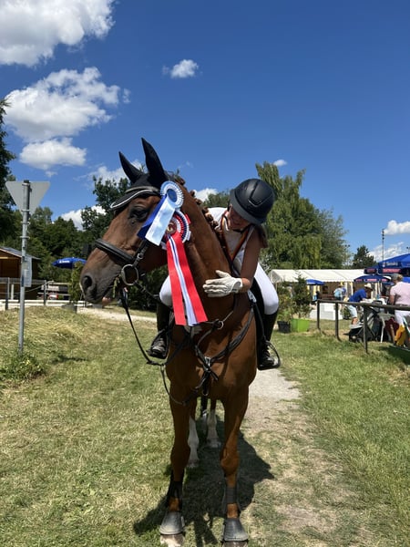 Zum Verkauf steht ein eleganter Brandenburger Warmblut-Wallach, geboren im Jahr 2015. Derzeit ist er mit 14 Jährigen Tochter E-Plaziert. Bei unserem Vorgänger war er im Springen L-Plaziert. Ein Parkour gibt er immer 120 % und es bemüht, keine Fehler zu machen. Er hat ein angenehmes Go beim Springen, was auch ideal für Anfänger ist. Unser charmante Fuchs überzeugt durch sein ausgeglichenes Wesen und seine Vielseitigkeit im Springsport als auch in der Dressur. Er beherrscht alle Lektionen der Klasse L und fliegende Wechsel ebenfalls. . Dank seiner soliden Grundausbildung ist er sowohl für ambitionierte Freizeitreiter als auch für turnierorientierte Reiter bestens geeignet. Im Gelände ist er ein absolutes Verlass Pferd, sowohl alleine als auch mit anderen Pferden. Er geht brav in den Henger und ist mit zwei Eisen beschlagen. Im E & A Springen ist er ein Schleifengarant (1a Rimondo-Biografie) Mit seinem kraftvollen Sprungvermögen und seiner guten Einstellung zum Springen zeigt er sich stets motiviert und zuverlässig im Parcours. Ein zuverlässiger Partner, der durch sein angenehmes Temperament und seine gute Rittigkeit begeistert. Ideal für Reiter, die einen erfahrenen, gut gerittenen Springpferd suchen. Er ist ein idealer Lehrmeister für unsere Tochter gewesen, leider müssen wir uns aus gesundheitlichen Gründen von unserer Tochter von ihm trennen. Wir wünschen uns für ihn ein schönes Zuhause, weshalb Platz vor Preis gilt ! Bei Fragen und Interesse schreiben Sie uns gern eine WhatsApp oder rufen uns unter 0177 8798913 an.