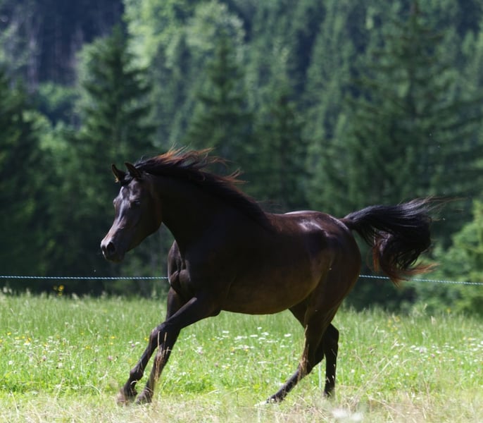 Étant donné que nous passons à une monte exclusivement en étalons noirs, c'est avec le cœur lourd que nous vendons nos jolis poulinières colorées. Notre BP Es’mee est vraiment exceptionnelle, elle se distingue par son tempérament affectueux... on pourrait presque dire qu’elle a une touche de trop de tendresse, elle est calme, curieuse et ouverte à tout, c’est ainsi que l’on la décrirait. Elle a une conformation très correcte, avec une origine intéressante : GG Scherapee d’Europe Al Khidar x Primus S (noire homozygote). Si vous êtes intéressé, n’hésitez pas à demander plus d’informations, je peux vous répondre volontiers par WhatsApp, car nous sommes en pleine montagne avec une mauvaise réception téléphonique. Un transport est envisageable.