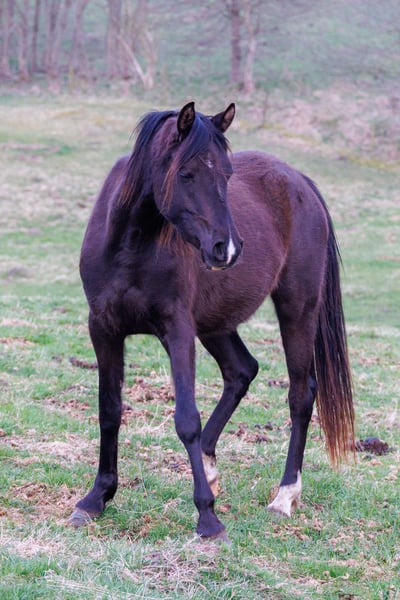 Ein schwarzes Fohlen, das im Feld steht — stark, neugierig, lebendig — und ihr Erbe weiterträgt.