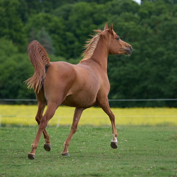 Mireya has been bred with the goal of becoming a good riding horse. She predominantly comes from Russian lines. From this dam line, we have horses that compete in endurance up to LDR, in dressage up to class S, and in leisure sports. Depending on how they are trained, they offer a wide range of possibilities. The sire, A Magic Man of Kossack, was the highest-rated stallion of the association for two consecutive years. More detailed and always up-to-date information is available on the Vogelsberg Arabians' website. Mireya has grown up on large pastures in mixed herds. She has had a stress-free life so far and has been treated lovingly by us humans. She trusts us and responds very sensitively in handling. In the hierarchy, she is rather in the middle here.
