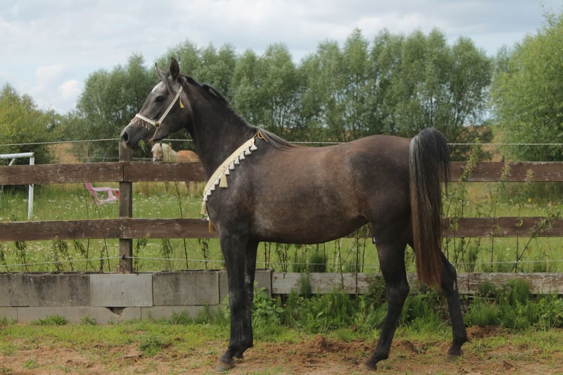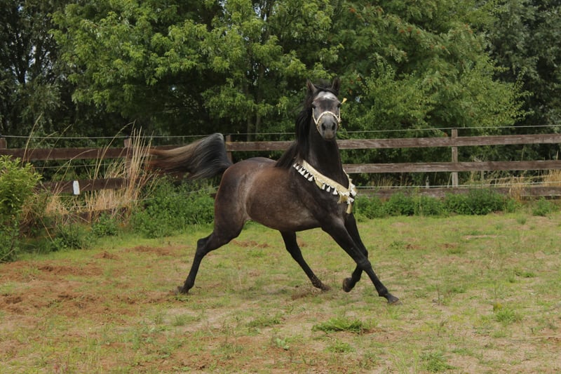 This beautiful and typy Arabian mare is looking for a new owner. She impresses with her friendly nature and easy handling. Her pedigree combines performance with beauty. Notably, she has a very elastic trot and a powerful canter. She is very expressive in movement, agile, and well-balanced. I can also easily imagine her excelling in Western riding. Despite her breed, she has a very calm and balanced temperament. She is very human-oriented, eager to learn, and, as mentioned, straightforward to handle. She was born here and raised in a herd. She is accustomed to box stall housing but is currently on pasture 24/7. Over the summer, she was gently backed at the farm but was interrupted as the trainer moved to southern Germany. Videos are available via WhatsApp! She stands approximately 15.5 hands tall.