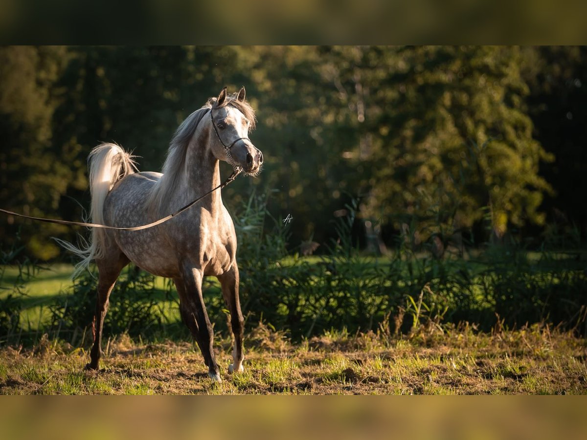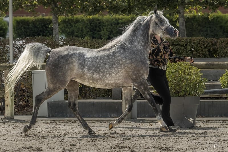 Elmyrah ist eine 7-jährige arabische Vollblutstute. Ihr Vater Sharahm (von Gharam) ist ein Hengst, der zahlreiche Showwettbewerbe gewonnen hat, darunter die Bronzemedaille bei den Weltmeisterschaften im Jahr 2025. Auch Elmyrah hat bei Turnieren überzeugt, beispielsweise bei der belgischen Meisterschaft, wo sie im Alter von 4 Jahren den 3. Platz belegte. Nach ihrer Showkarriere brachte sie 2025 ein Fohlen zur Welt und wurde anschließend eingeritten. Daher eignet sie sich auch für eine Zuchtkarriere. Seit 2025 arbeitet sie im Training, ist noch etwas grün, macht aber schnelle Fortschritte. Sie ist eine freundliche Stute mit einem gewissen Charakter. Sie kann auch sensibel sein. Sie ist in der Lage, alleine in der freien Natur alle drei Grundgangarten zu gehen, setzt aber Erfahrung beim Reiter voraus. Sie arbeitet auch im Roundpen an den Grundlagen des Dressursports. Geeignet für Freizeit, Ausritte, Ausdauer, Dressur, Zuchtstute usw. Wir wünschen ihr eine liebevolle Familie.