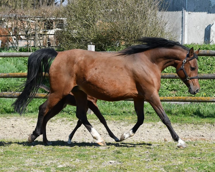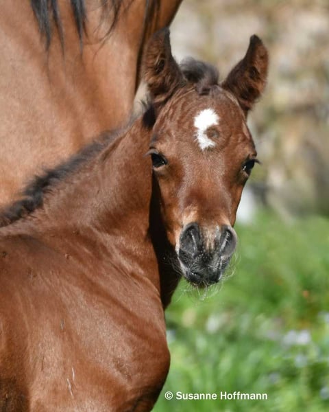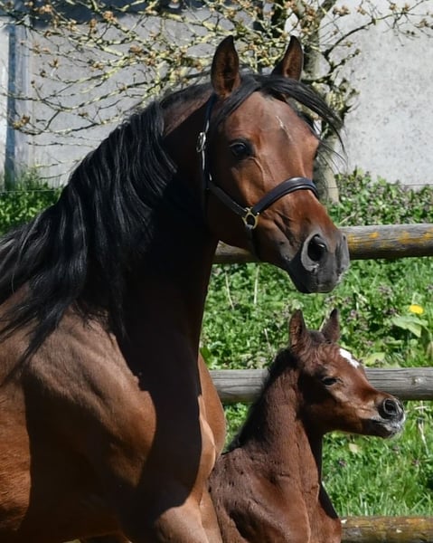 This colt impresses not only with his expressive head, large eye, and outstanding pedigree but also with an almost ideal conformation, a masculine presence with a well-set neck, a lovely sloping shoulder, and he is also very muscular. The combination of proven performance lines and modern show lines from Arabian bloodlines is nearly perfect, and he already demonstrates strikingly expansive, lively movements. His dam comes directly from the Polish State Stud Janów Podlaski and is a full-blooded Arabian mare like I love—well-built, with excellent riding horse points, a good foundation, feminine and refined with a large eye. Her outstanding movement is simply captivating. She is shown in the last two pictures. The sire of this foal is the stallion Exxon MA, who has already been successfully presented at shows and has won several championship titles. Secure this wonderful colt now, as I can easily see him as a future breeding stallion.