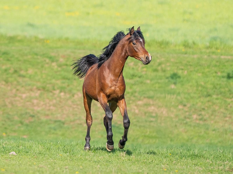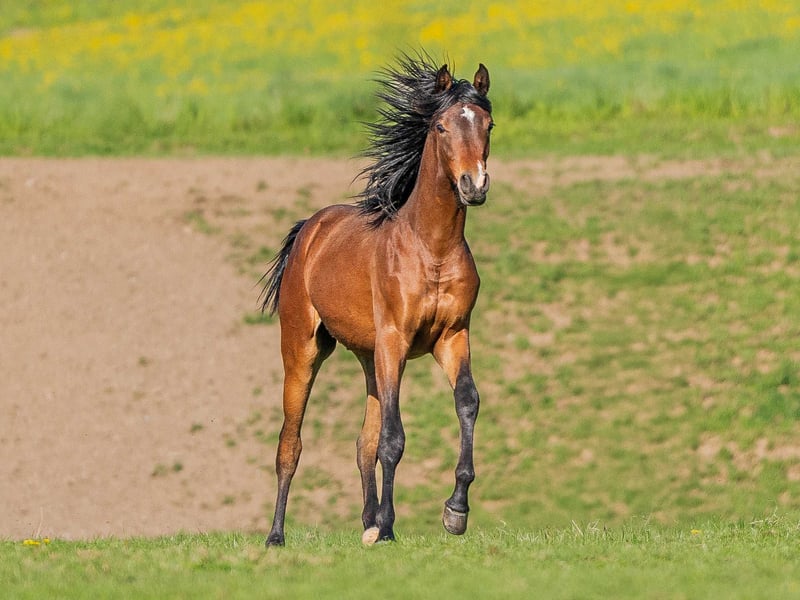 Stylish and extremely correct young Arabian colt in a bay jacket. Prosecco is a curious and open-minded foal without being pushy. He is fearless, people-oriented and has a friendly character. Prosecco grows up with other mares and foals and is excellently socialized. He has already learned the basics of foal training, i.e. touching everywhere, haltering, lifting legs etc. It goes without saying that our foals are wormed regularly, are already microchipped and receive a pedigree certificate and an equine passport. If desired, he can continue to be raised by us or move to a new home from around October. Prosecco would be delighted to receive a visit. Please contact us.