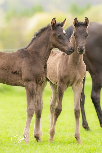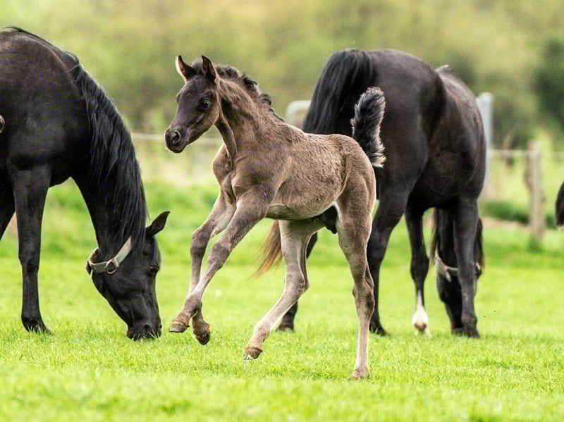 Strong and extremely correct young purebred Arabian colt in black jacket. Meris has virtually no markings, only on the back of his pads. He is a very curious and open-minded foal, fearless, people-oriented and with a friendly character. He is growing up with other mares and foals and is excellently socialized. He has already learned the basics of foal training, i.e. touching everywhere, haltering, lifting legs etc. It goes without saying that our foals are wormed regularly, are already microchipped and receive a pedigree certificate and an equine passport. If desired, he can continue to be raised by us or move to a new home from around October. Meris would be delighted to receive a visit. Please contact us.