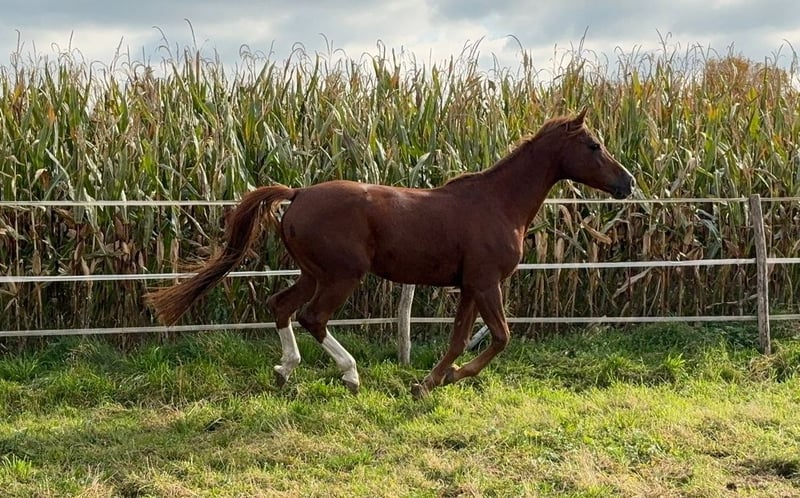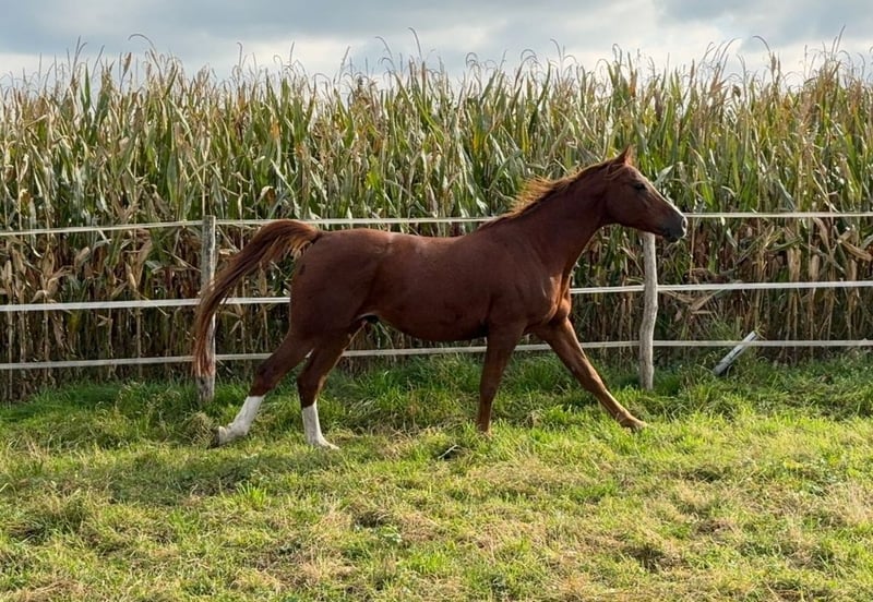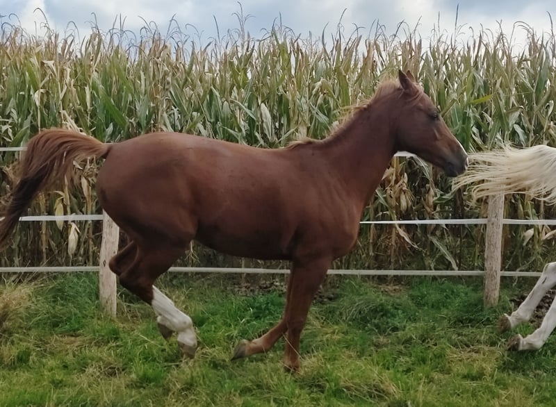 Super beautiful compact, strongly built 6-year-old Thoroughbred Arabian with a height of 1.60m is looking for the best home. He has an extremely strong hindquarters and naturally moves in a nice connection. He is a lot of fun during arena work. He has been used in various disciplines, including a lot of trail riding, three endurance rides, swimming in the lake, gymnastics cavaletti courses, arena work, and lunging in a side reins. He has a calm temperament. He is absolutely traffic-safe, whether trucks, tractors, or a train pass directly by him, it doesn't bother him at all. He loads into the trailer easily and without any issues. He lives in a group with a gelding and a mare, which he really enjoys. He is totally uncomplicated in living with other horses. Since companionship is very important to him, it is my concern that he continues to have this. At the moment, he is barefoot or with glue-on shoes. He is a real ray of sunshine, always up for fun. He will do anything for his treats. He learns new things very quickly, as he is very clever.
