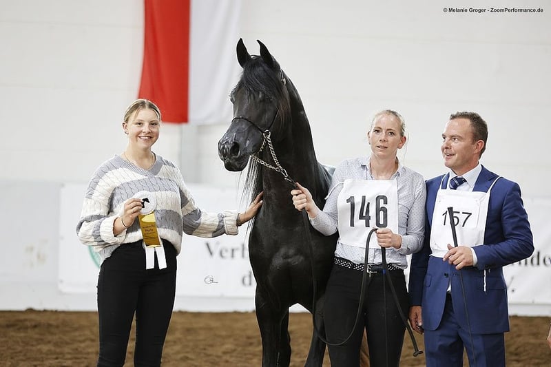 "Pueblo" è un bellissimo e elegante stallone nero con una struttura corretta e andature eccellenti. Pueblo è stato importato da noi come stallone di 3 anni da Janow Podlaski ed è stato utilizzato per la monta (è stato registrato con il nastro d'oro). Lo scorso anno abbiamo deciso di offrirgli una vita probabilmente migliore come castrone e cavallo da sella. Ora viene nuovamente lavorato regolarmente sotto sella e si presenta bene e in modo ordinato sia a mano che sotto sella. Si muove nelle tre andature di base sia in pista che nel terreno. Attualmente è in paddock con un castrone e la convivenza sta andando molto bene. Naturalmente, Pueblo ha i documenti e il passaporto equino ed è regolarmente sverminato e vaccinato.