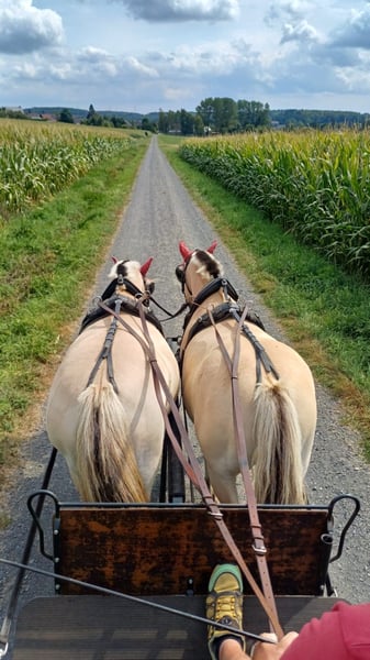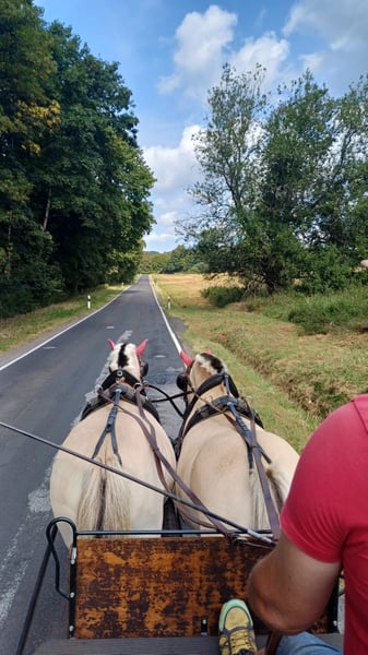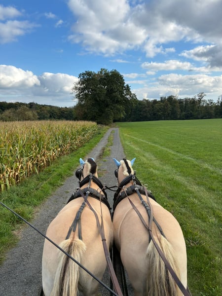 Mare (11) and gelding (18), both well-trained and traffic-safe driving ponies, are both comfortable going left and right. The price is for the mare; the gelding is available for €3,000. They stand at 145 cm and are light chestnut with a flaxen mane and tail. Both are healthy and accustomed to pasture, open stable, and robust management. Due to health reasons, a new home is sought, preferably together.