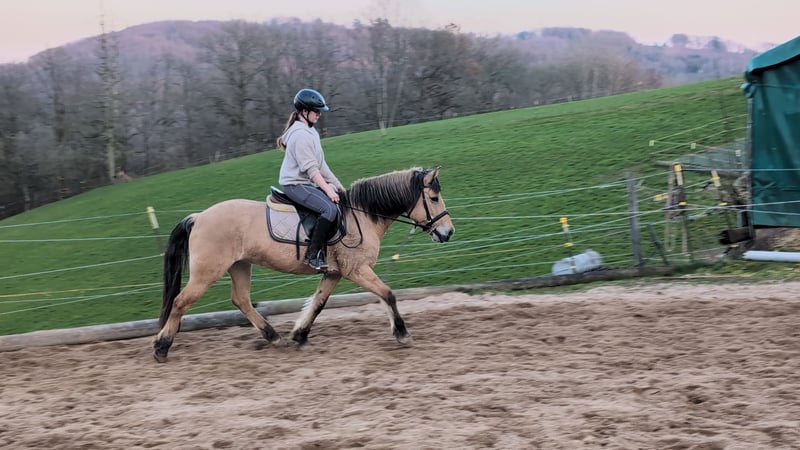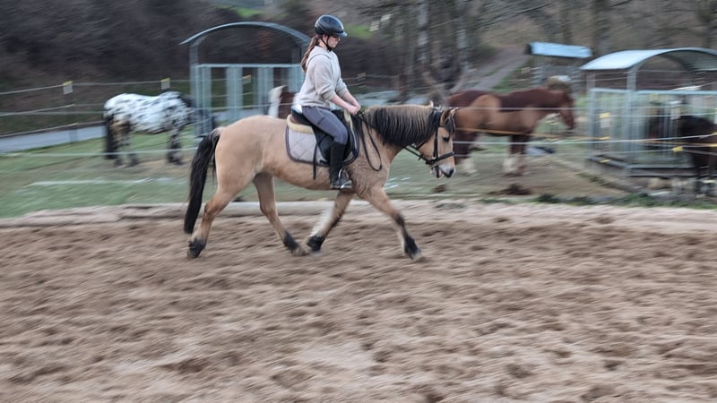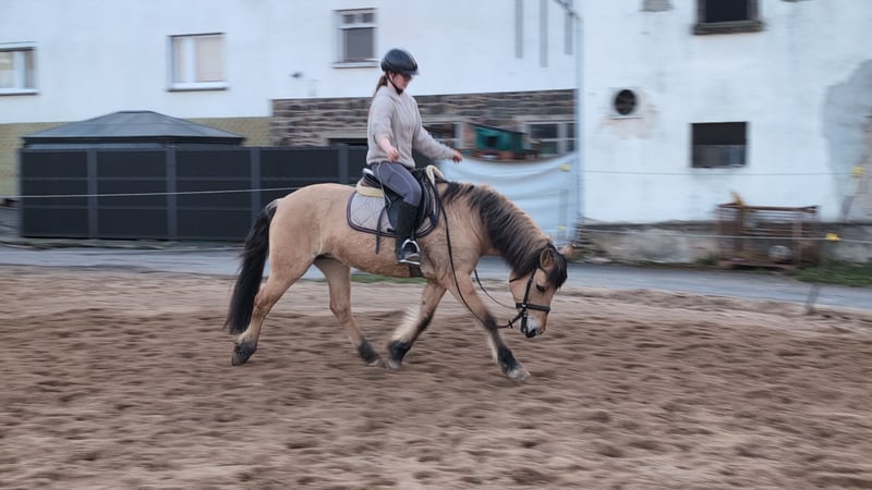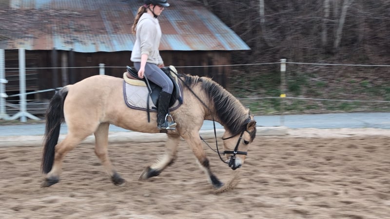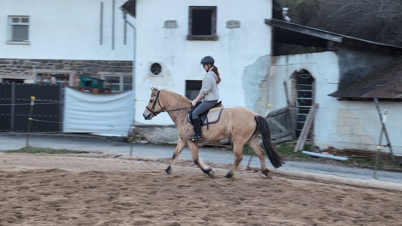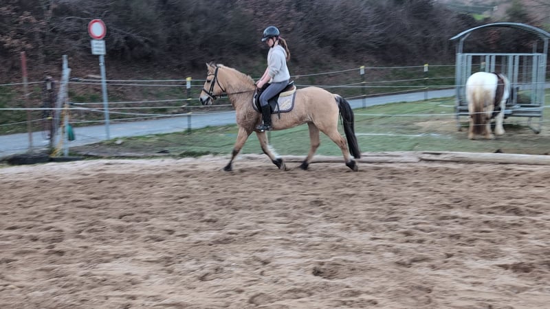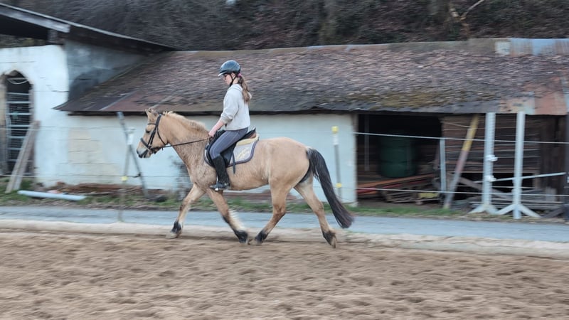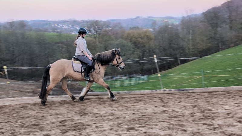 Goldi, a beautifully ridden Norwegian mare Goldi is familiar with the arena, the outdoor riding area, and the terrain in all three gaits and moves very nicely, responding very lightly to the rider's aids. An excellent school horse, also very suitable for therapeutic riding or as a lunging pony, equipped with a very beautiful and calm canter. She is housed in a mixed herd during the day. For further questions, please contact us by phone or via WhatsApp at 015122313319.