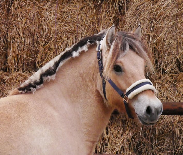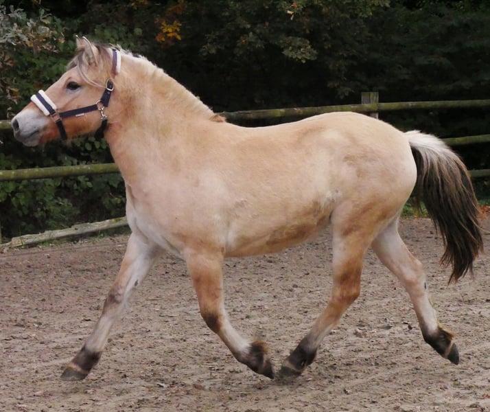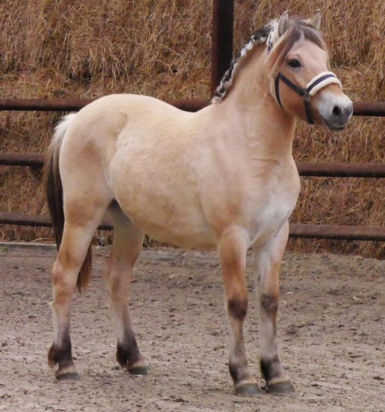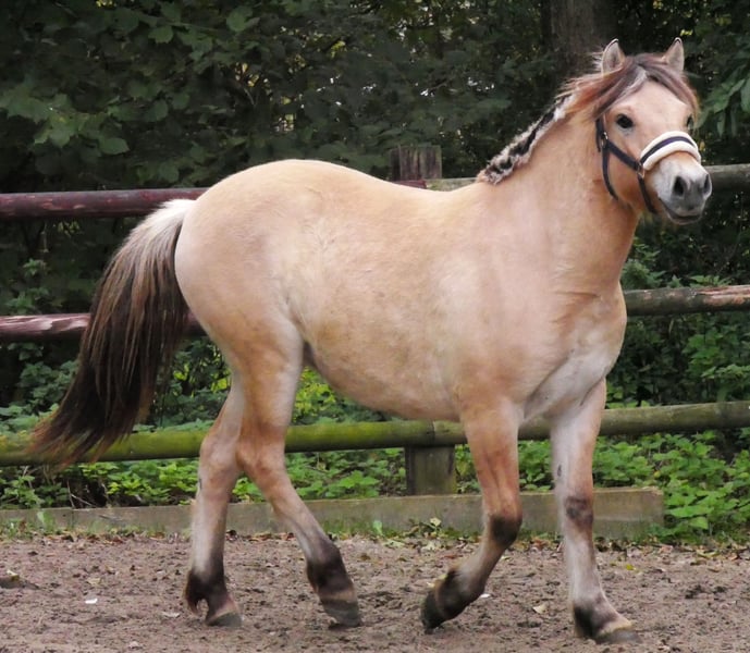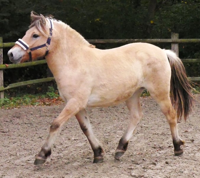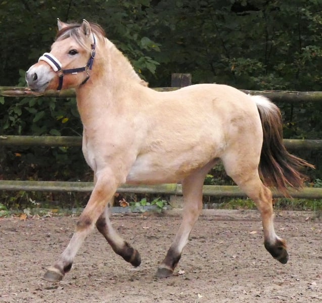 Name: Vyarny Van’t Gors Gender: Mare Date of Birth: April 26, 2024 Height: 13.8 hh (138 cm) Breed: Norwegian Fjord Pedigree: Lyckängs Tempo x Havik von Haavard Beautiful, well-grown yearling mare with good conformation. She currently lives in a herd with three other Fjord mares. Vyarny is healthy and robust; she could also be kept in an open stable. Please feel free to contact us at +49 176 62495567 if you are interested.