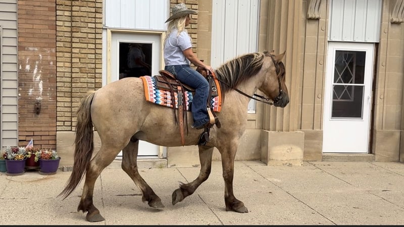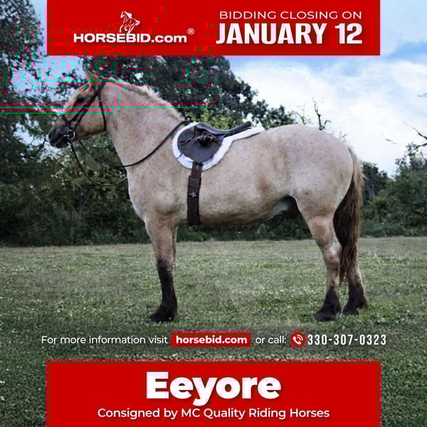 ♦️𝐍𝐄𝐖 𝐘𝐄𝐀𝐑'𝐒 𝑬𝒙𝒕𝒓𝒂𝒗𝒂𝒈𝒂𝒏𝒛𝒂♦️ Happening now thru MONDAY | JANUARY 12th - Available EXCLUSIVELY on HorseBid's website! For more details and to register visit: www.Horsebid.com CONSIGNOR CONTACT: MC Quality Riding Horses 330-307-0323 LOCATION: Battle Creek, IA BREED: Fjord/Brabant REGISTERED: No REGISTERED NAME: Eeyore COLOR: Dun Roan HEIGHT: 15.3 AGE: 5 GENDER: Gelding Once-in-a-Lifetime FJORD/BRABANT Gelding – Ride & Drive – Safe, Sane, and Sound If you are searching for a horse that truly stands apart from the rest, Eeyore is that horse. It is rare to find one with this level of mind, His personality is one of his greatest qualities—kind, affectionate, and simply impossible not to love! Eeyore is a 15.3-hand, 5-year-old roan Fjord/Brabant Draft cross gelding with a solid build, beautiful bone, and an exceptionally kind expression. He is the type of horse people spend years searching for—and very few ever find. Temperament & Personality Eeyore is genuinely kind, quiet, and people-oriented. He meets you at the gate every day and truly enjoys attention. He is not pushy, nervous, or herd bound. He gets along well with other horses and has been exposed to all types of livestock. His personality is unmatched—loving, willing, and eager to please. This is a horse you can trust to have the same demeanor every ride, whether he is worked daily or left off for weeks. Handling & Ground Manners • Stands quietly tied for brushing, bathing, saddling, and bridling • Easy to catch, lead, and handle • Stands well for farrier and routine care • Loads and hauls well • Excellent manners on the ground and around other horses and livestock Under Saddle Eeyore is a confident, enjoyable ride that is safe and fun for a wide range of riders. He rides alone or in a group and is not buddy sour. • Walks, trots, and canters willingly • Smooth, comfortable gaits • Steady, honest, and forgiving • Will go any direction you point him • Confident crossing creeks, ditches, mud, water, and uneven terrain • Not spooky and stays level-headed in new environments He has been ridden everywhere—from trails to highways, and even into town. Traffic, commotion, and new situations do not bother him. Driving Eeyore is also broke to drive and does it exceptionally well. He is quiet, responsive, and confident whether driving around the pasture or down the road. He would make an excellent carriage, pleasure, or family driving horse. Versatility Eeyore is the definition of a true all-around horse: • Trail riding • Pleasure riding • Riding alone or in groups • Driving / carriage work • Livestock exposure • Family or confidence-builder type Soundness & Care • 100% sound • Solid feet and bone • Easy keeper • Healthy and ready to go to work or enjoy! The Kind You Don’t Replace Eeyore is the kind of horse that becomes a once-in-a-lifetime partner, not just a ride. Safe, sane, versatile, and genuinely enjoyable to own, he is the type people wish they had bought when they had the chance. Horses like this are incredibly hard to find—and even harder to replace. After nearly two years of owning Eeyore and countless miles together, I can honestly say he has been a joy every step of the way. He is now looking for the forever family he deserves!