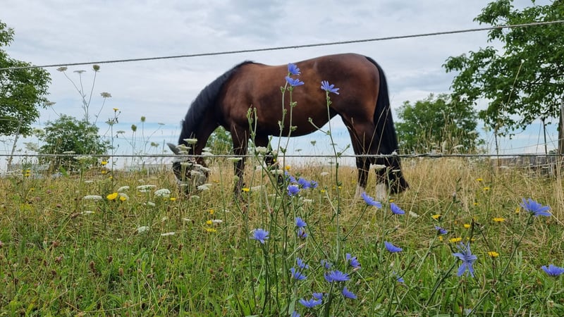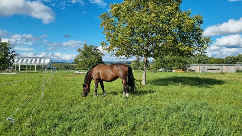 For sale is a charming, stunning dark bay mare by Diacontinus, excelling with three excellent basic gaits. Her trot mechanics and pleasant riding sensation are particularly noteworthy. She is highly trainable and quickly adapts to new exercises. After a day off, she is always manageable and attentive to her handler. This mare has a lovable, people-oriented character and is consistently clear-headed, friendly, and uncomplicated in daily handling. She always aims to please her rider. Over the past year, she has been ridden exclusively on an outdoor riding arena, making her well-acquainted with environmental stimuli such as farm machinery, animals, cyclists, children, etc., as well as various weather conditions. Under saddle, she requires a confident and secure rider who can set the working mode and boundaries with a gentle hand. Then, she is an absolute dream to ride! Suitable for ambitious amateurs at a good A-level, so not an entry-level horse. She has been ridden recreationally and trained up to A-level dressage, showing significant potential for further development. Her pedigree suggests talent over fences, although this has not been specifically trained recently. A versatile career in eventing is also possible. She has no competition experience to date. Her health is particularly noteworthy. She has been veterinary checked and is currently in excellent condition. No previous illnesses, allergies, or old injuries. She is barefoot with very good hooves. She has been regularly seen by osteopaths, chiropractors, dentists, and farriers. She has been vaccinated against tetanus and influenza (next due Dec. 2025) and dewormed most recently in Nov. 2025. Handling and feeding are straightforward. She is looking for a few dedicated riders, ideally a person she can form a close bond with and trust. A wonderful, characterful mare with a lot of charisma and quality! To prevent ride tourism, a fee of €40 is charged for a trial ride.