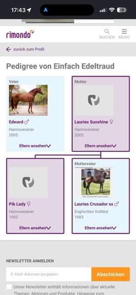 Mare "Einfach Edeltraud" (Traudl) A characterful chestnut mare with an excellent pedigree seeking a supportive home Our beloved mare, affectionately called "Traudl," impresses with her presence, temperament, and a highly interesting Hanoverian lineage (including Edward x Lauries Crusador xx). ⸻ 🩺 Health & History Traudl has previously undergone: - Suspensory ligament surgery on all four legs - Tendon injury on the front right leg She has recovered well and completely from these issues, has been veterinary checked, and is currently fit for work. 👉 Important: Due to her medical history, she is no longer suitable for competitive sport. However, she is well-suited for demanding leisure riding with appropriate training. ⸻ 🏇 Current Status - Currently in training - Being ridden 5–6 times per week (riding & ground work) - Well-built and in training ⸻ ✨ Character & Handling - Very sweet and pleasant in daily handling - Requires a clear, experienced rider - Not suitable as a beginner or children's horse 👉 With sufficient movement, she shows: - Calmness - Balance - Reliability ⸻ 🌿 Behavior - Gets along well with other horses - Can be ridden in groups outdoors, currently unsure alone 👉 Important to know: As a sport-bred horse, she needs regular exercise. After 1–2 days of rest, she should be prepared briefly (e.g., lunging), then she is ready to work again. ⸻ 🧬 Pedigree Very interesting performance lineage with proven lines such as: - Edward - Embassy I - Lauries Crusador xx ⸻ Traudl is an honest, sensitive, and motivated mare seeking a reliable, experienced handler. A wonderful horse for riders who are not looking for a competitive show horse but a quality leisure partner with a solid foundation. ⸻ 📹 Videos available upon request 🏇 Trial riding possible
