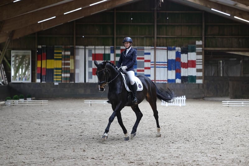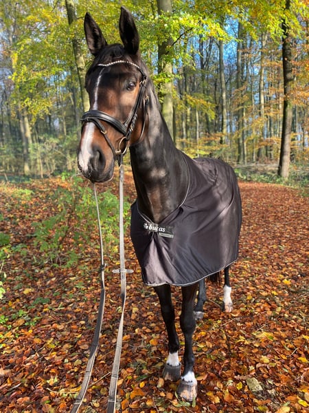 Our "Blümchen" (whose real name is "B-Dur") is a 10-year-old Hanoverian mare with a heart of gold and a touch of elegance. She is a true gem in handling, always a pleasure to work with in daily interactions. She is very affectionate towards people and a reliable, healthy all-rounder. Whether it’s dressage training, cuddling, ground work, or hacking, Blümchen is always motivated and consistently well-behaved and dependable. She has already foaled twice, which meant her training started a bit later. Nevertheless, she demonstrates three very good basic gaits, as evidenced by her L-level placement in competitions. She is currently at novice level and progressing towards medium level, with several movements, such as travers, already performed quite confidently. Blümchen is a rider-friendly horse that always provides a pleasant and secure riding experience. This trait is likely inherited from her sire, the dressage stallion Belissimo M, who has endowed her with willingness to perform and excellent movement quality. She didn’t quite reach Olympia level like her famous half-sister Bella Rose, but that’s not necessary. ;-) Additionally, she enjoys pole work and jumps small crosses, combinations, and small courses. We are seeking a loving home for Blümchen where she can continue to be supported and appreciated. We see her as a perfect partner for amateur riders with competitive ambitions or for young riders looking for a kind horse to grow with. Please feel free to contact me for further information or to arrange a personal viewing.