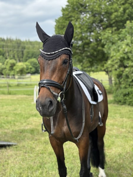 Zum Verkauf steht eine brave 12-jährige Hannoveraner Stute. Sie ist in der Dressur mehrfach bis zur Klasse L platziert und vor allem für kleinere Klassen das perfekte Pferd für den Einstieg in den Turniersport. Sunny springt auch brav einen kleineren Parcours auf E/A Niveau, wurde hier allerdings nicht weiter gefördert. Im täglichen Umgang zeigt sie sich brav, zuverlässig und unkompliziert. Da ihr leider die Einstellung für den höheren Sport fehlt, wird sie schweren Herzens abgegeben. Sie hatte im Winter eine Verletzung am Griffelbein, welche komplett ausgeheilt ist und sie nicht beeinträchtigt. Auch in der aktuellen Saison wurde sie noch erfolgreich auf Turnieren vorgestellt. Sie wurde regelmäßig geimpft und entwurmt und ist absolut verlade- und schmiedefromm. Ich wünsche mir für Sunny einen Endplatz, in dem sie in kleineren Klassen auf Turnieren vorgestellt oder freizeitmäßig geritten wird. Videos werden auf Anfrage gerne verschickt.