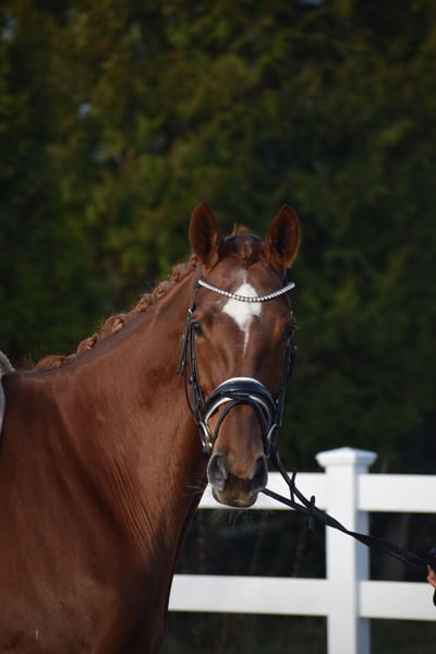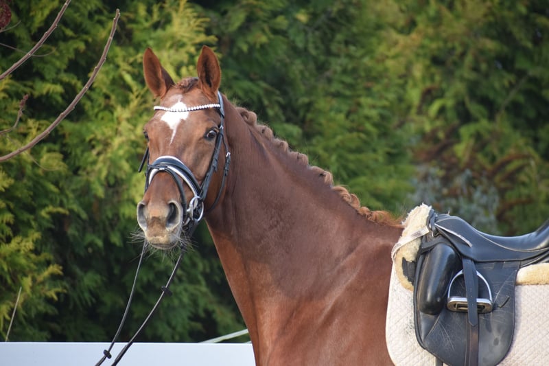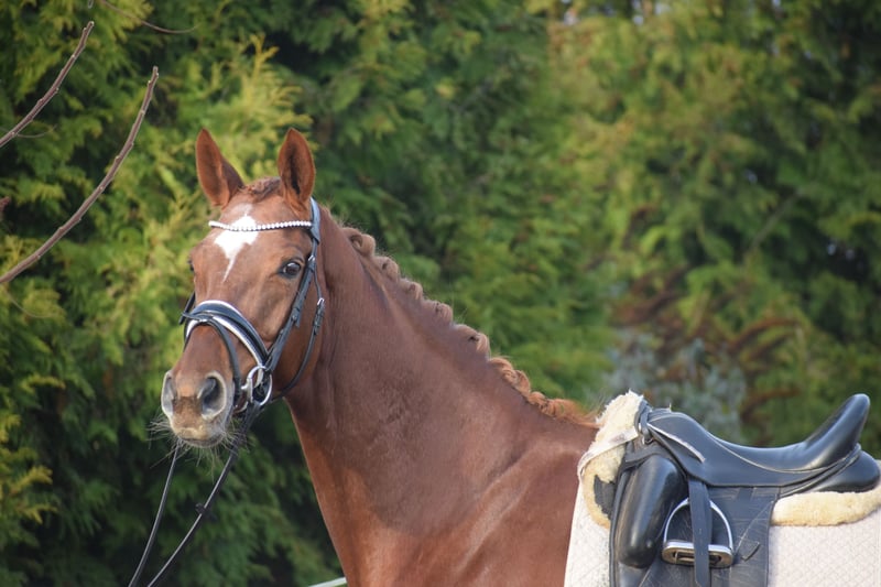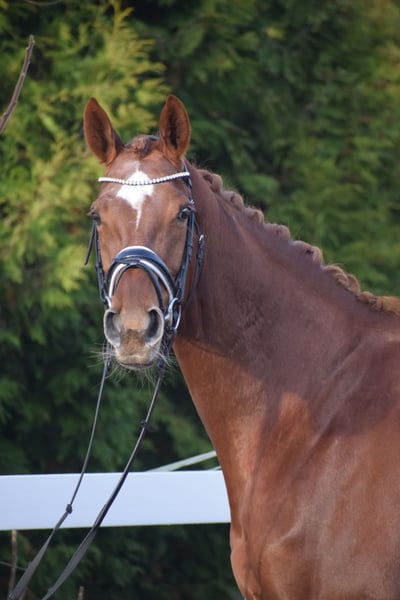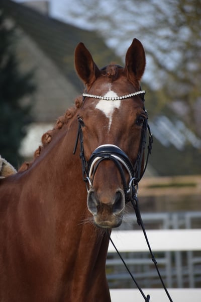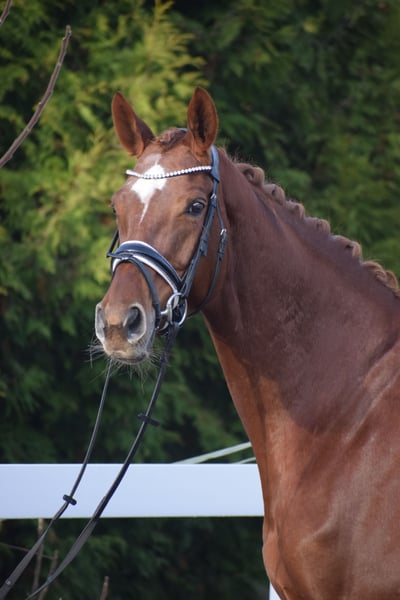 LEICHTRITTIGE, SCHÖNE & LIEBE DRESSUR LEHRMEISTERIN MIT TYP UND GANG - PLATZIERT - 5 FOHLEN - PSG NIVEAU - PIAFFE - Junioren geeignet! Zum sofort Lostreiten! Zum Verkauf steht, in Vertretung des Besitzers, diese, mit auffälliger Mechanik ausgestattete, 13 j., platzierte, Zucht erfolgreiche, 174cm große, hannoveraner dunkelfuchs Stute mit leistungs- und härte-geprägter Abstammung von FLORISCOUNT x AARKING XX. "Fleur de Lys" konnte sich bereits als Jungpferd auf dem Turnier in starken Starterfeldern behaupten und kann platzierungen in Dressurpferdeprüfungen der Klasse A (7,2) über L (7,5) bis M (7,8 / 3. Platz) vorweisen. Aufgrund Ihrer modernen Abstammung, dem harmonische Gebäude und dem guten Interieur, wurde Sie daraufhin in der Zucht eingesetzt und brachte 5 sehr gelungene Fohlen. Sie steht im Hannoveraner Hauptstutbuch. Wieder in Arbeit unter dem Sattel, ist diese Stute immer Leistungsbereit, zeigt spielerisch ihre bereits vor Jahren ernernten hohen Lektionen, ruft diese schnell ab und erfeut sich an der täglichen Arbeit. Sie ist in der Arbeit unerschrocken, abgeklärt, leichtrittig, fehler verzeihend und mit feiner Anlehnung bei guter Selbsthaltung - daher ist Sie absolut Juniorengeignet und eine tolle Lehrmeisterin. "Fleur de Lys = Lilie" ist wie Ihr Name schon verrät, wunderschön und weiß mit typvollem Gesicht, harmonischem Gebäude und wirklich tollem Seitenbild zu imponieren. Mit Ihrer Abgeklärtheit und einem Herz aus Gold, bereitet Sie einem im Umgang und in der täglichen Arbeit immer Freude. Die Tatsache, das Sie mit 13j. und 5 Fohlen, bereits alle S* / PSG Lektionen, sowie die meisten INTER I Lektionen, sowie PIAFFE beherrscht, beweißt Ihr hohes maß an Rittigkeit; Leistungs-, Ausbildungsbereitschaft und freude am Sport. Setzt sich "Feur" in Bewegung, zeigt sich eine leistungsbereite Sportlerin mit freude am großen Gang. Sie besticht durch Ihr auffällig schönes Seitenbild, mit guter Selbsthaltung und natürlicher Aufrichtung. Dadurch entwickelt Sie die Schwunghaften Gangarten mit viel Mechanik, Einkelung und Knie toll ins Bergauf, mit auffällig freier Schulter und gut heran geschlossener Hinterhand. Ihre feine Anlehnung und gute Rückentätigkeit machen es dem Reiter leicht, "Fleur" mit feinen Hilfen zu bedienen. Wer also ein LEHRMEISTER, aber auch eine liebe FREUNDIN zum Schmusen sucht, der ist bei "Fleur" genau richtig. Eine echte gelegenheit ein tolles Pferd zu erwerben. Gerne kann "Fleur" nach dem Kauf auch bei uns im professionellen Beritt verbleiben und auch auf Turnier vorgestellt werden. Ein aktueller, guter, klinischer und röntgenologischer (Standart + Rücken) TÜV liegt vor.