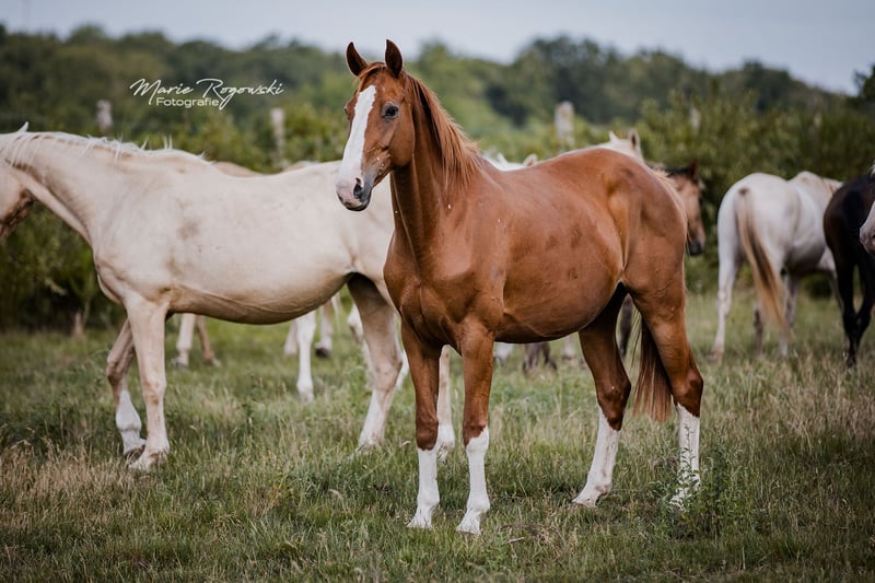 Diva 585 jest jedną z nielicznych córek DANCIER (De Niro - Lancier), co mówi samo za siebie. Po stronie matki, po World Cup - Grande, rodowód nie pozostawia nic do życzenia. Klacz przejęliśmy w 2015 roku od (nierzetelnego) klienta, który nabył ją od stajni jeździeckiej. Klacz była z powodzeniem pokazywana przez jeźdźców amatorów aż do zaawansowanego poziomu ujeżdżenia w młodym wieku (lista rejestracyjna FN I dla niemieckich koni jeździeckich 2014) i miała już tam ogierka. W naszym programie hodowlanym genetycznie rozjaśnionych koni sportowych, urodziła jeszcze trzy wspaniałe ogierki w 2018 (palomino <170cm, Oldenburg), 2020, 2022 (patrz galeria zdjęć) z różnych kojarzeń przez naturalną hodowlę. Jest bezproblemową matką. Źrebięta są zawsze bardzo popularne. Może być kryta jednym z wielu naszych ogierów. Diva jest kasztanem z dodatkowym wariantem genetycznym "birdcatcher spots". Karta DNA dostępna. 2014 zarejestrowana w Księdze Stadnej I Westfalskiej Księgi Stadnej. 2019 dalsza rejestracja w księdze stadnej I Związku Oldenburgów. Uznany również przez Zangersheide w 2020 roku. 2021 IFCE zarejestrowana i uznana jako klacz hodowlana we Francji (Stud-book de reproduction: FACTEUR DE SELLE FRANCAIS). Nasze stado hodowlane żyje na zewnątrz przez cały rok na bardzo rozległych użytkach zielonych. Diva jest obecnie główną klaczą odpowiedzialną za prawie 40 klaczy w wieku od 1 do 24 lat, ze stałą dziewczyną. Zawsze bez problemów ukończyła kilka długodystansowych podróży ciężarówką. Oddajemy ją do stałego ruchu. Przy starannej, profesjonalnej pielęgnacji kopyt może być ponownie użytkowana. Możliwe regularne przycinanie kopyt, odrobaczanie, szczepienia - aktualizowane na życzenie - a także leczenie stomatologiczne i osteopatia. Sprzedaż prywatna po osobistym spotkaniu. Zakwaterowanie jest zapewnione bezpłatnie.