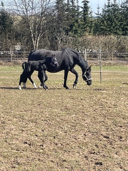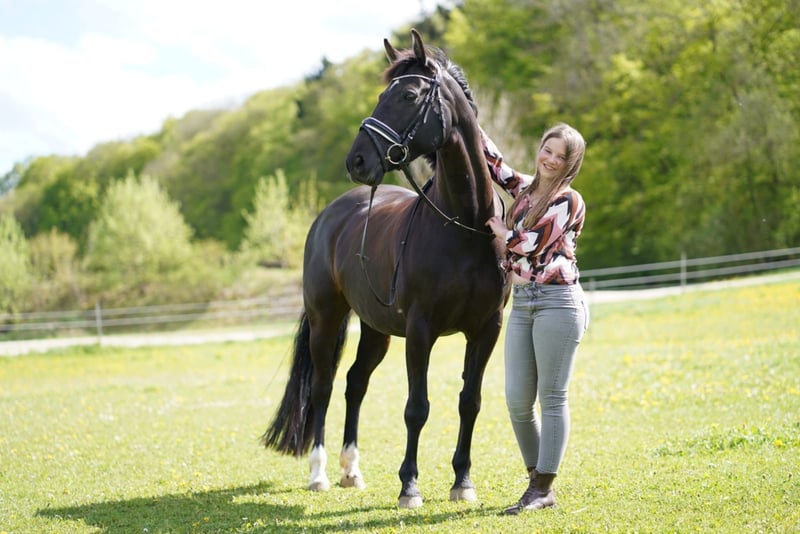 Resi, eine wunderschöne Hannoveranerin in schwarzer Jacke, kam vor 6 Jahren zu mir. Damals war ich 11 Jahr alt und sofort schockverliebt in diese tollen Maus. Resi ist eine sehr motivierte, feine Stute, die immer alles Recht machen möchte. Schnell haben wir uns aneinander gewöhnt und sind auf unseren ersten Turnieren gestartet. 2020 haben wir E-Dressur mit 9,3 gewonnen, darauf folgten mehrere A-Platzierungen. 2021 sind wir sehr erfolgreich auf A-Niveau unterwegs gewesen, sammelten unsere ersten Erfahrungen in L-Dressur. Bei den Baden-Württembergischen Meisterschaften in Meißenheim errieten wir uns den 4. Platz. 2022 bin ich mit Resi nur noch wenig auf dem Turnier gewesen, da ich da schon andere Pferde zu Reiten hatte. Aufgrund Ihrer sehr guten Abstammung (direkte Rotspon Tochter), haben wir 2023 angefangen mit Ihr zu züchten. 2024 hat Resi uns eine wunderschöne Tochter von "Rock for me" geschenkt und letztes Jahr (2025) hatte sie einen wunderschönen Hengst von "Diamantenglanz" bei Fuß. Resi hat immer beim ersten besamen aufgenommen und die Geburten verliefen ohne Komplikationen. Sie war immer eine fürsorgliche und liebevolle Mutter. Aufgrund einer leichten Fehlstellung in den Vorderbeinen wollen wir sie an einen ambitionierten Freizeitreiter, der Spaß an der feinen Arbeit mit einem tollen Pferd hat, gerne ins Gelände geht und Zeit mit dem Pferd verbringt. Seid Oktober arbeite ich wieder mit Ihr, sie hat auch schon einige Runden mit unseren Reitschülern gedreht, da sie aber ein sehr fein an der Hand zu reitendes Pferd ist, kommt sie mit Reitanfängern nicht so gut klar. Sie kennt Stangenarbeit und Cavaletti Training, geht gerne ins Gelände und ist auch bei der Bodenarbeit motiviert dabei. Resi war im Dezember 2025 beim Zahnarzt und beim Chiropraktiker. Sie ist vollständig, turniermäßig, geimpft, wurde immer regelmäßig entwurmt und den Schmied hat sie auch immer alle 6-8 Wochen gesehen. Sie lebt bei uns in einer Stutenherde mit täglichem Auslauf auf der Weide oder auf dem Paddock, nachts in der Box. Während sie Fohlen bei Fuß hatte, lebte sie in der Zuchtherde im Offenstall oder 24/7 auf der Weide. Natürlich wünschen wir uns ein 10* Zuhause für sie, wichtig ist mir, das sie einen Menschen hat, der für sie da ist und sich Zeit für sie nimmt. Sie braucht eine artgerechte Haltung und genügend Auslauf an der frischen Luft mit Artgenossen. Aufgrund Ihrer Größe ist sie kein Gewichtsträger, braucht aber einen feinen Reiter, der schon unabhängig mit der Hand ist. Sie hat noch nie irgendwelche Schweinereien, wie bocken oder steigen gezeigt, hat auch keine "Hobbies". Für ein Kennenlernen mit Probe Reiten wird eine Gebühr in Höhe von 25 Euro in bar fällig.