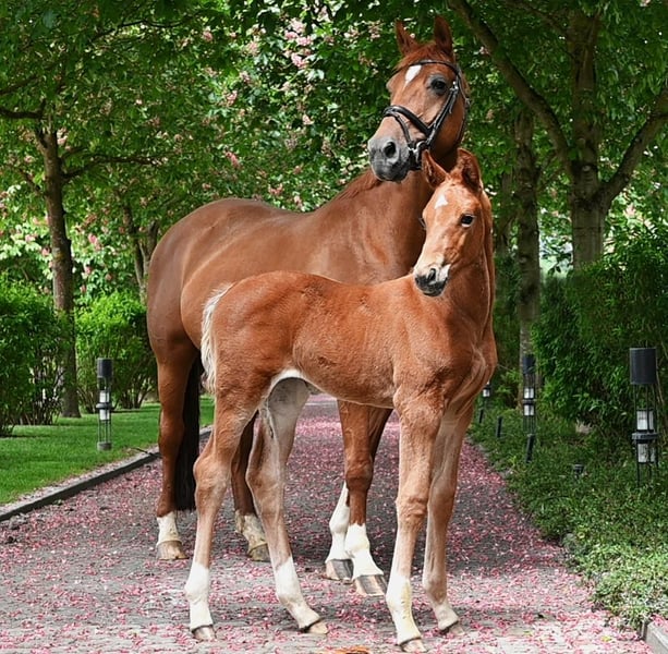 It is with a heavy heart that we part with our affectionate and proven broodmare Rubina, born in 2010. Rubina combines the outstanding bloodlines of Rotspon and Matcho AA and has already given us impressive offspring who are successful in dressage up to advanced level. Rubina is currently in foal to Vital Hit OLD, a talented dark chestnut stallion who impresses with his strong type, quality of movement and elegant appearance. Vital Hit OLD has quickly made a name for himself in dressage sport: 2022: Oldenburg State Champion of 3-year-old stallions; qualified for the Bundeschampionat with high scores in basic gaits and rideability. In 2022 he passed the short VA test and in January 2023 the sport test in Münster, both with scores well above 8.0. In 2023, he was victorious in novice class dressage tests for young horses with top scores (up to 8.7) and qualified for the World Championships for Young Dressage Horses in Ermelo, where he excelled in the small final with 84.2 %. Vital Hit OLD is descended from the renowned Vitalis, who became famous as the reserve winner of the NRW licensing and produced numerous licensed sons as well as champion stallions and Bundeschampions. His dam Loretta Live belongs to one of the world's most influential mare lines, as a full sister to Royal Hit and half-sister to the important stallions Diamond Hit and Sandro Hit. Rubina is an experienced, caring mother with a calm and balanced nature. Her bond with people and her excellent character make her an ideal broodmare and companion. Her previous foals by Vital Hit OLD have great dressage potential and also impress with their rideability and willingness to perform. Rubina offers a rare opportunity for ambitious breeders who value performance, quality and character. She will only be sold to experienced, loving hands. We look forward to hearing from you for further information and viewing appointments! E-mail: richard.tschrepp@gmail.com Whatsapp: 0049 162 2377375 Phone: 0049 160 5298297