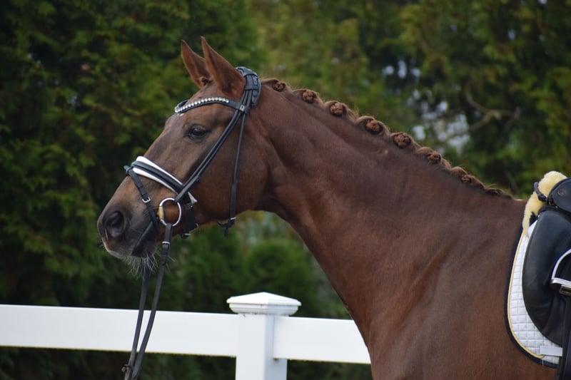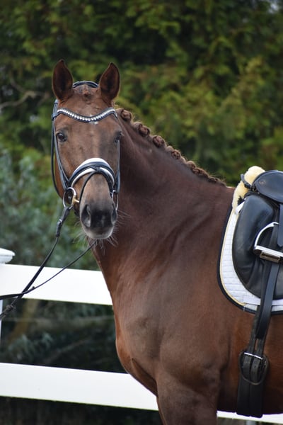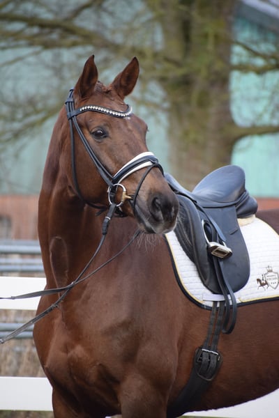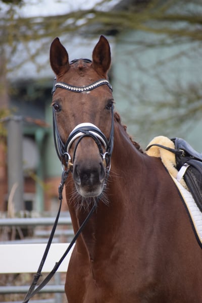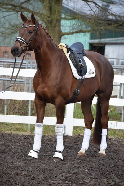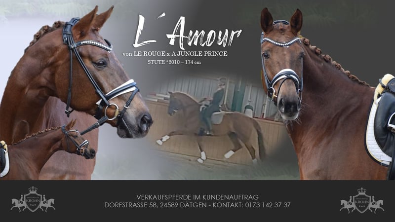 LEHRMEISTERIN / SCHOOLMASTER - ÄUSSERST BEWEGUNGSSTARK, TOP FITT, TURNIERERFOLGREICH, WUNDERSCHÖN, MEHRFACH PLATZIERT BIS M** - S* / PSG TRAINIERT - FÜR DEN AMBITIONIERTEN REITER - AUS BESTEM ZÜCHTERHAUS Zum Verkauf steht in Vertretung des Besitzers (aufgrund eigener Krebserkrankung),diese sympathische, turniererfolgreiche, ehrgeizige 172 cm große, 16-jährige hannoveraner dunkelfuchs Stute, mit leistungsgeprägter Abstammung von LE ROUGE x A JUNGLE PRINCE. "L´Amour" weiß auf vielen Ebenen zu beeindrucken. Schon Optisch besticht sie durch ihre dunkelfuchs Jacke, harmonische Gebäudeaufteilung, ihrem typvollem Gesicht und toll muskulierten Körperpartien. Unter dem Reiter besticht "L´AMOUR" durch Ehrgeoz, Leistungsbereitschaft, einem schönen Seitenbild und taktvoll balancierten Bewegungen. Trab & Galopp sind geprägt von Elastizität, reeler Tragkraft, viel Schulterfreiheit und Knieaktion, sowie einem aktiven, weit durchfußendem Hinterbein. Sie verfügt über viel Abdruck, Raumgriff, Schub und Willen. Schon in Jungpferdeprüfungen konnte "L´AMOUR" mit ihrer Qualität überzeugen und Siegte in einer Dressurpferdeprüfung L mit der Note 8,1. Die Stute kann zahlreiche Platzierungen von A über L bis aktuell M** (2ter Platz) vorweisen. Im Training befindet sie sich auf S* PSG Niveau. In der täglichen Arbeit zeigt sie sich hoch Motiviert und mit Ehrgeiz ausgestattet, andererseits total Unerschrocken und ohne Unarten. Auch unter Anfängern in Kinderreitstunden am Ausbinder ist Sie ruhig, zuverlässig und ausgeglichen. Eine Stute die alle Möglichkeiten besitzt, mit einem ambitionierten Reiter, noch viel weiter zu kommen oder einem schwächeren Reiter eine tolle Lehrmeistern zu sein. Im Umgang überzeugt "L´AMOUR" durch Ihren feinen, ruhigen und ausgeglichenen Charakter. Beim fertig machen zuhause oder auch auf Turnier ruht Sie in sich. Sie ist dem Menschen sehr zugewandt, sucht anschluss und liebevolle Steicheleinheiten. "L´AMOUR" könnte nach dem Kauf auch bei uns in professionellem Beritt verbleiben und gerne von uns auf Turnieren vorgestellt werden. Ein guter aktueller klinischer und röntgenologischer (Standard + Rücken) TÜV liegt vor!