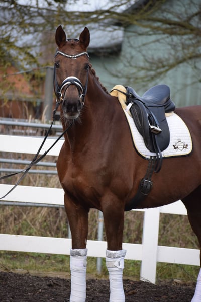 LEHRMASTER / SCHOOLMASTER – EXTREM BEWEGUNGSSTARK, TOP FIT, TURNIERSIEGER, WUNDERSCHÖN, MEHRFACH PLATZIERT BIS M** – S* / PSG AUSGEBILDET – FÜR DEN AMBITIONIERTEN REITER – AUS BESTEM ZÜCHTERHAUS This friendly, successful competition mare is available for sale on behalf of the owner (due to her own cancer diagnosis). She is a 16-year-old, 172 cm tall Hanoverian mare with a performance-oriented pedigree by LE ROUGE x A JUNGLE PRINCE. "L´Amour" impresses on many levels. Visually, she captivates with her dark chestnut coat, harmonious conformation, typy face, and well-muscled physique. Under saddle, "L´Amour" stands out for her ambition, willingness to perform, a beautiful side profile, and tactfully balanced movements. Her trot and canter are characterized by elasticity, lightness, shoulder freedom, knee action, and an active, ground-covering hind leg. She offers plenty of impulsion, scope, push, and determination. From her young horse competitions onward, "L´Amour" has proven her quality, winning a dressage horse class with a score of 8.1. She has numerous placings from A to L, currently competing at M** level (2nd place). She is training at S* PSG level. In daily work, she is highly motivated and eager, yet completely fearless and free of vices. Even with beginner riders in children's riding lessons, she remains calm, reliable, and balanced. A mare with all the potential to achieve great things with an ambitious rider or to serve as an excellent schoolmaster for a less experienced rider. In handling, "L´Amour" impresses with her fine, calm, and balanced character. She remains composed during grooming at home and at competitions. She is very affectionate, seeks contact, and enjoys gentle strokes. After purchase, "L´Amour" could also remain in professional training with us and be presented at shows by our team. A current veterinary and radiological (standard + back) health certificate is available!