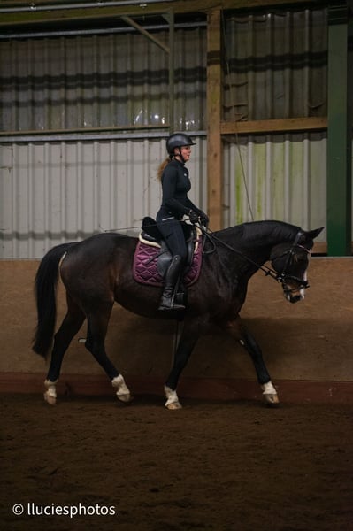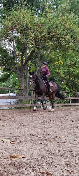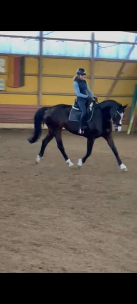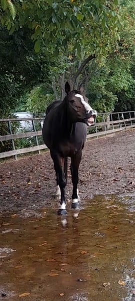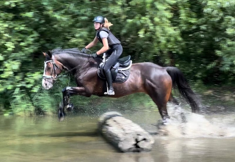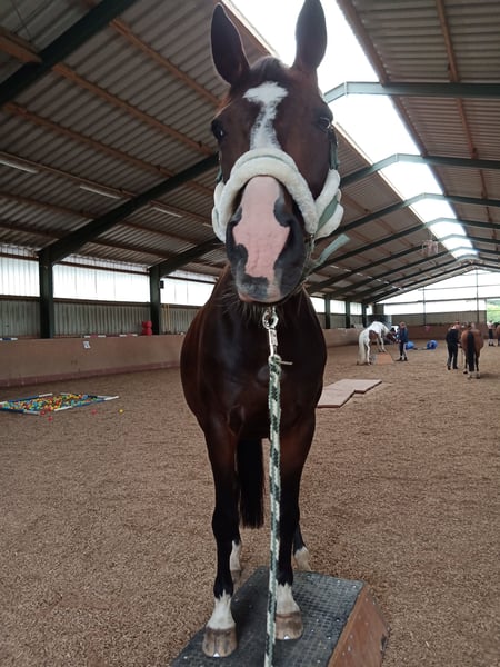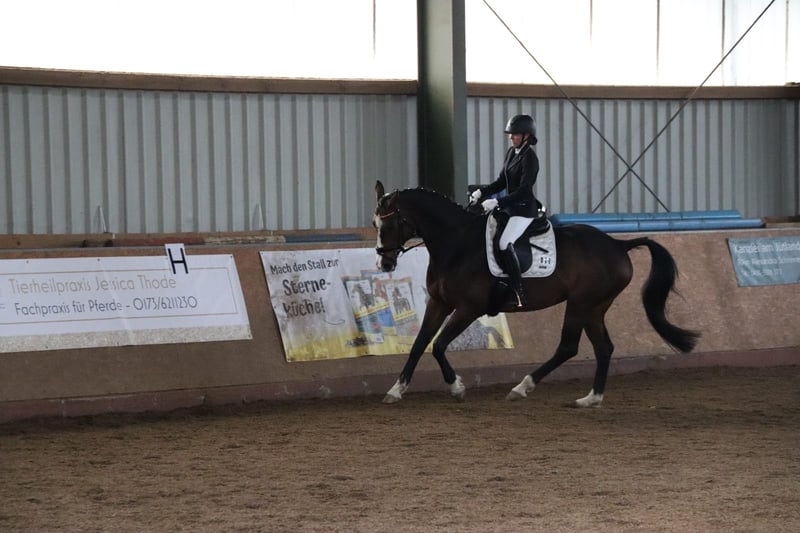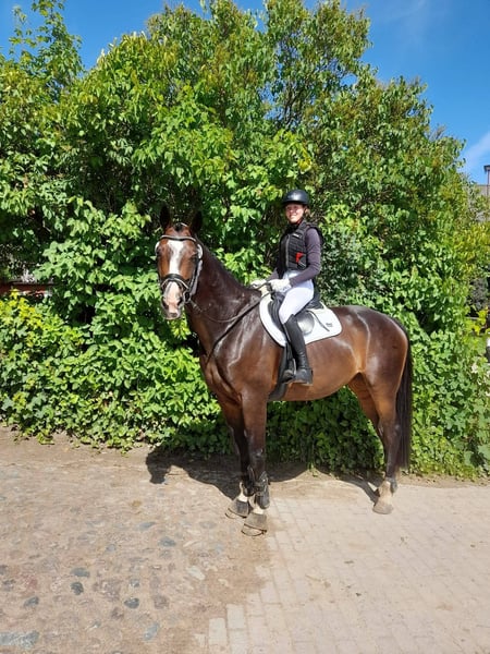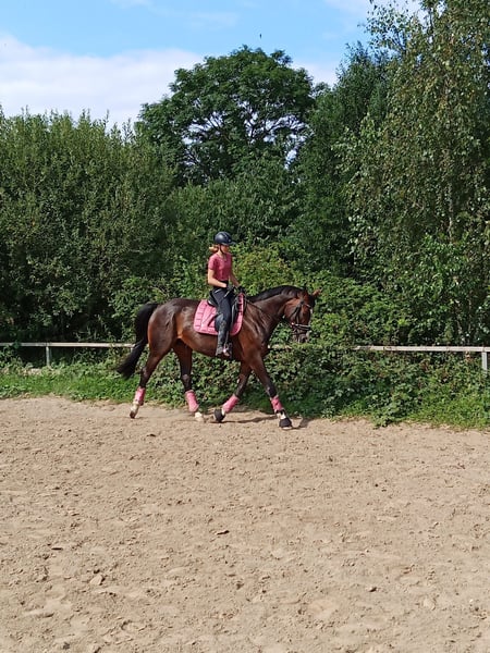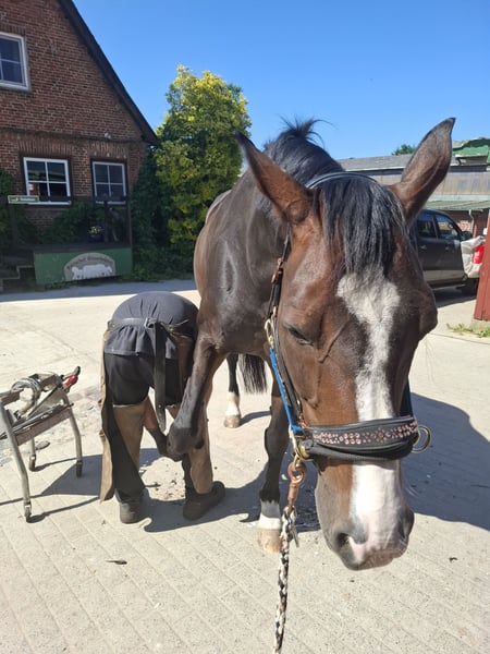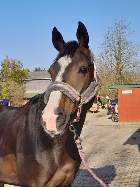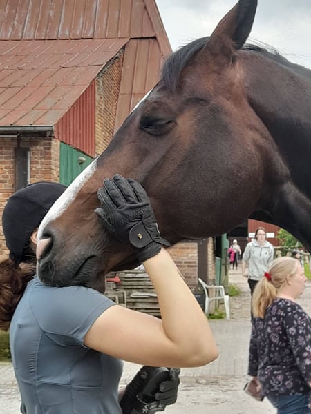 Schweren Herzens müssen wir uns von unserer Hannoveraner Stute Harley, liebevoll "Snöd" genannt, trennen. Unsere 16 jährige Snöd ist ein wundervoller Allrounder und ein echtes Herzenspferd. Sie überzeugt jeden Tag durch ihren wundervollen Charakter und ihre Motivation unterm Sattel. Ihre menschenbezogene, süße und verspielte Art machen sie auf dem Hof sehr beliebt. Besonders viel Spaß zeigt sie bei der täglichen Dressurarbeit und Ausritten. Auch in der Bodenarbeit zeigt sie sich immer sehr talentiert und aufmerksam. Kleine Tricks wie Küsschen geben kann Snöd auch;) Im Sommer liebt sie es Baden zu gehen und schwimmt dann auch gerne (sie ist keineswegs wasserscheu). Ins Gelände geht sie sowohl in der Gruppe als auch alleine und ist dabei immer sehr brav, unerschrocken und zuverlässig. Beim Reiten ist sie immer kopfklar. Sie bockt, steigt und tritt nicht und selbst bei einem Schreck hüpft sie maximal einmal zu Seite. Ein absolutes Verlasspferd, auch im Winter! Im Springen ging sie unterm Reiter bis A-Springen und im Freispringen in der Halle bis L-Springen. Allerdings ist das Springen aufgrund eines ausgeheilten Sehnenschadens hinten rechts nicht mehr möglich. In der Dressur glänzt Snöd dabei um so mehr. Hierbei wurde sie grundlegend auf A- Niveau gearbeitet. Auch einzelne L- und M-Lektionen wie Schulterherein, Außengalopp, Kurzkehrt und Traversalen kommen im Training vor. Beim Reiten ist sie, nach dem sie warm ist, gerne fleißig unterwegs. Auf kleinen Hof Turnieren zeigte sie sich stets von ihrer besten Seite und auch bei Reitabzeichen, wie dem RA5, RA4 oder dem LA5 hat sie alles gegeben und mit ihrer gutmütigen Art viele Richter überzeugt. Da Snöd aber das Hängerfahren nicht mag und wir ihr den Stress ersparen wollen, möchten wir sie nicht als Turnierpferd abgeben. Wir wünschen uns für Snöd einen Reiter, der sie reiterlich weiterhin fordern kann und der ein Pferd sucht, mit dem man vielseitig Spaß haben kann. Alltagstrubel auf dem Hof ist sie gewöhnt und dabei immer gelassen. Schreiende Kinder, Hunde, Katzen, Trecker, LKWs usw. bringen sie nicht aus der Ruhe. Snöd ist Schmiedefromm (trägt vorne zwei Eisen) und auch beim Tierarzt total unkompliziert. Die Zähne wurden jährlich gemacht, der Sattel regelmäßig kontrolliert und angepasst und sie wurde zudem regelmäßig entwurmt, geimpft und osteopathisch vorgestellt. Sie hat einen Ton, der tierärztlich abgeklärt ist und sie als Freizeitpferd in keiner Weise einschränkt. Da Snöd in bestimmten Situationen an der Hand sehr selbstbewusst werden kann übergeben wir sie nur an erfahrene Reiter! Wir wünschen uns für Snöd ein tolles Zuhause, in dem sie genauso sehr geliebt wird, wie bei uns und wo sie als Freizeitpferd weiterhin gefordert und beschäftigt wird. Sie steht aktuell in Boxenhaltung mit zweimal täglichem Gang aufs Paddock. Da sie ein sehr bewegungsfreudiges Pferd ist, wäre ein Offenstall für sie optimal. Sie ist sehr auf ihre Herde bezogen und rangmittig bis hoch. Da sie duch zu lange Fresspausen (länger als 3h) Magenprobleme bekommt, wäre ein gutes Futtermanagemant Voraussetzung. Wenn das funktioniert, hat sie mit dem Magen auch keine Probleme. Da sie vom Typ her ein sehr schlankes Pferd ist, kann sie bei genügend Bewegung 24/7 Heu bekommen, ohne großartig dick zu werden. Uns ist es sehr wichtig, dass sie in gute Hände kommt und bei ihren nächsten Besitzern ihren Endplatz finden darf. Platz vor Preis! Ausgewähltes passendes Zubehör u.a. ein Dressursattel von Passier, eine super sitzende Weidedecke von Amigo und eine Trense von Bridlery würden wir Snöd in ihr neues Zuhause mitgeben. Um Reittourismus vorzubeugen nehmen wir für das Probereiten 30€, die aber ggf. später mit dem Kaufpreis verrechnet werden. Wenn ihr das Gefühl habt, dass Snöd zu euch passen könnte, dann schreibt uns gerne;)